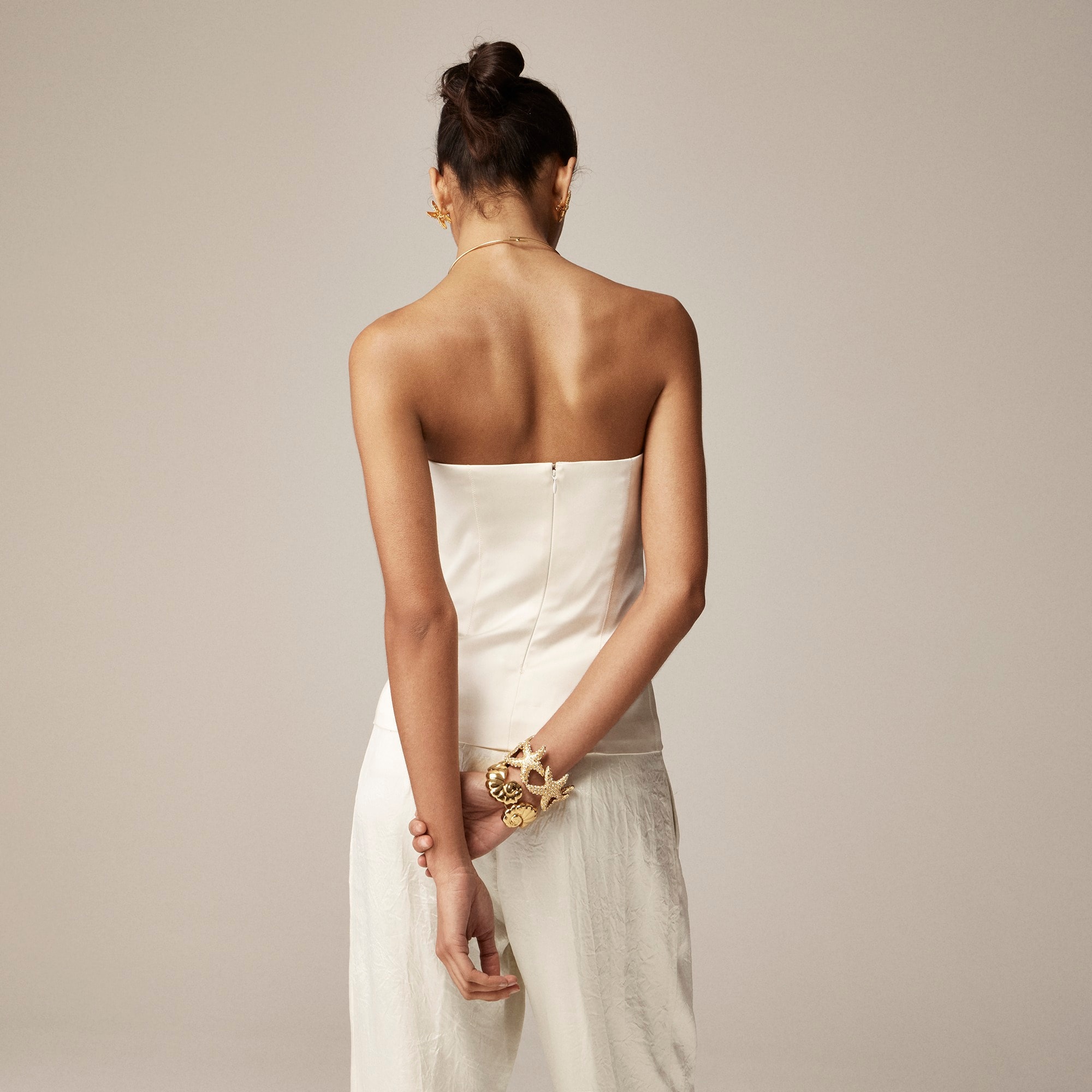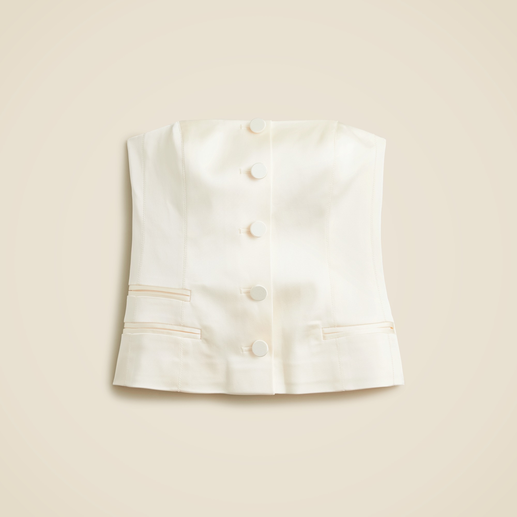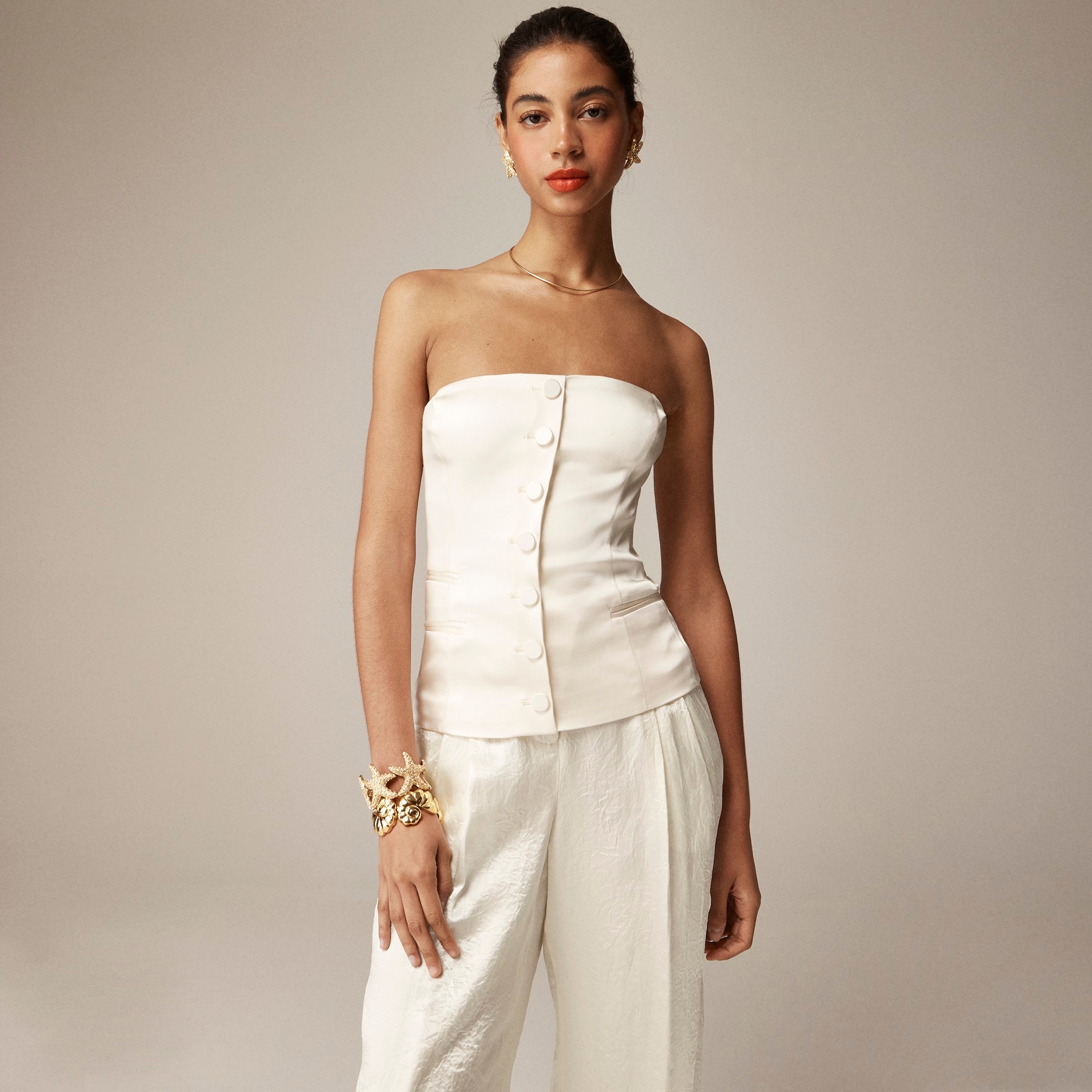 Introducing Anna October X J.Crew. A limited-edition capsule for brides and their guests, featuring Anna’s signature lingerie-inspired details and our favorite luxe fabrics. This instantly polished corset top comes in a strapless silhouette, with covered buttons down the front, pocket details and a subtly stretchy satin finish.