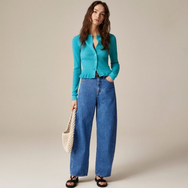 A fresh take on denim. It’s designed with a flattering high rise, a bow-shaped leg that tapers at the ankle and side-seam details that add structure to the shape.