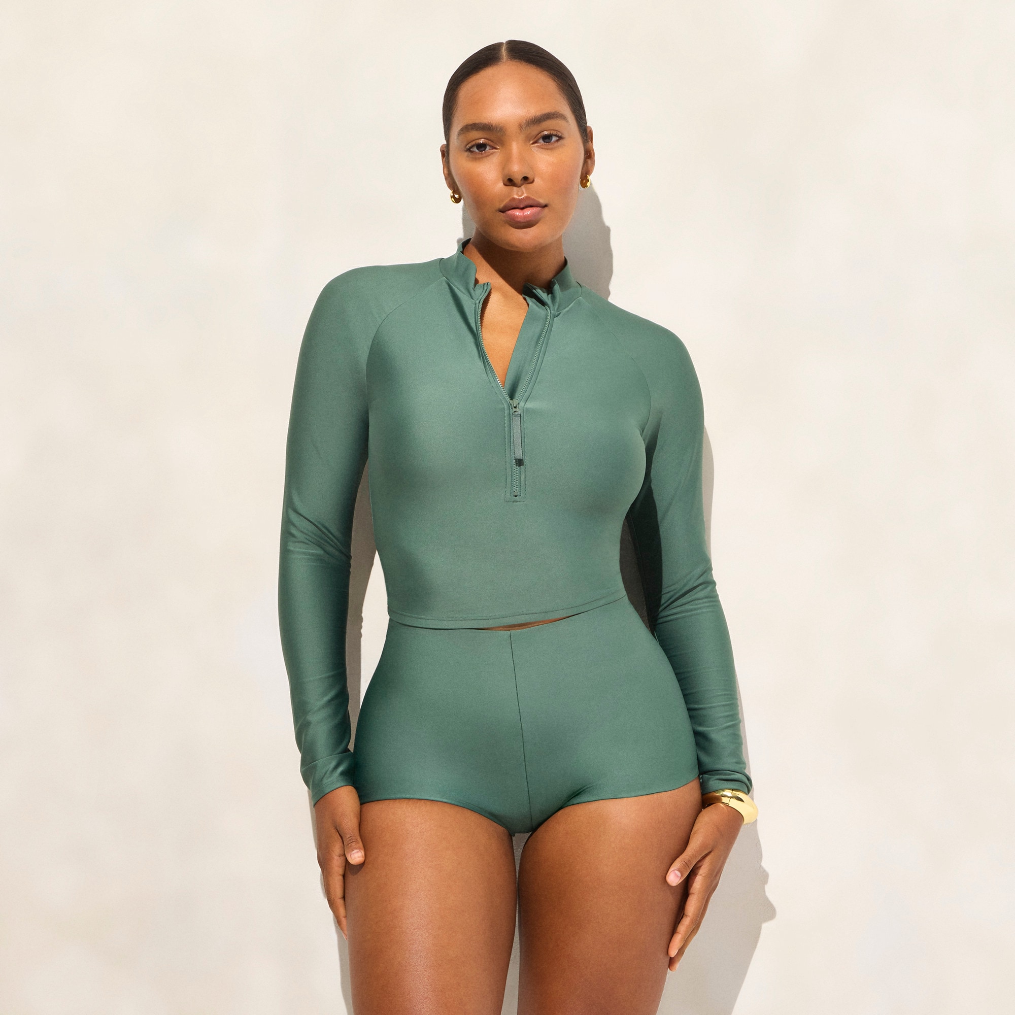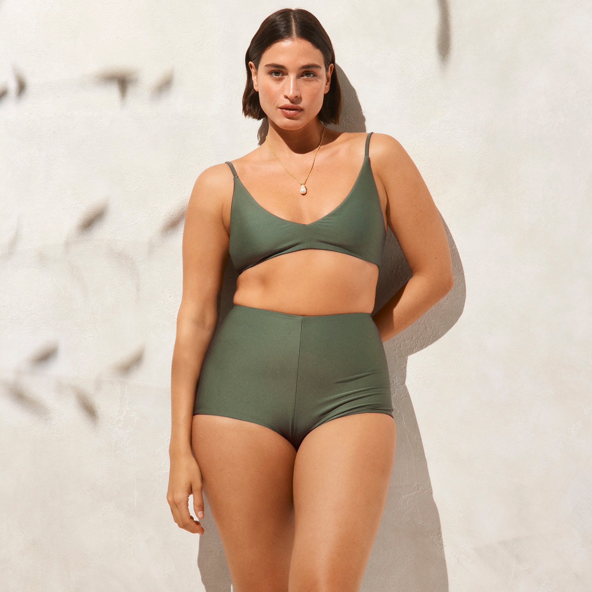 Introducing Classic Sculpt swim. Our new magic swim fabric, designed to hold you in and lift you up. It’s crafted from two layers of ultra-fine fabric that are knit together or u0026quot;interlockedu0026quot; for subtle compression with a lightweight feel. Plus, the comfy lining is designed to stretch out and then snap back into place, so your suit will always hold its shape. And we combined our heritage-inspired silhouettes with modern fabric-cutting techniques, so it fits like a beach-day dream. This higher-coverage option sits above the belly button and hits a little lower on the leg than your typical bikini bottom.