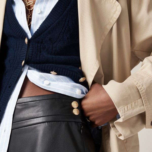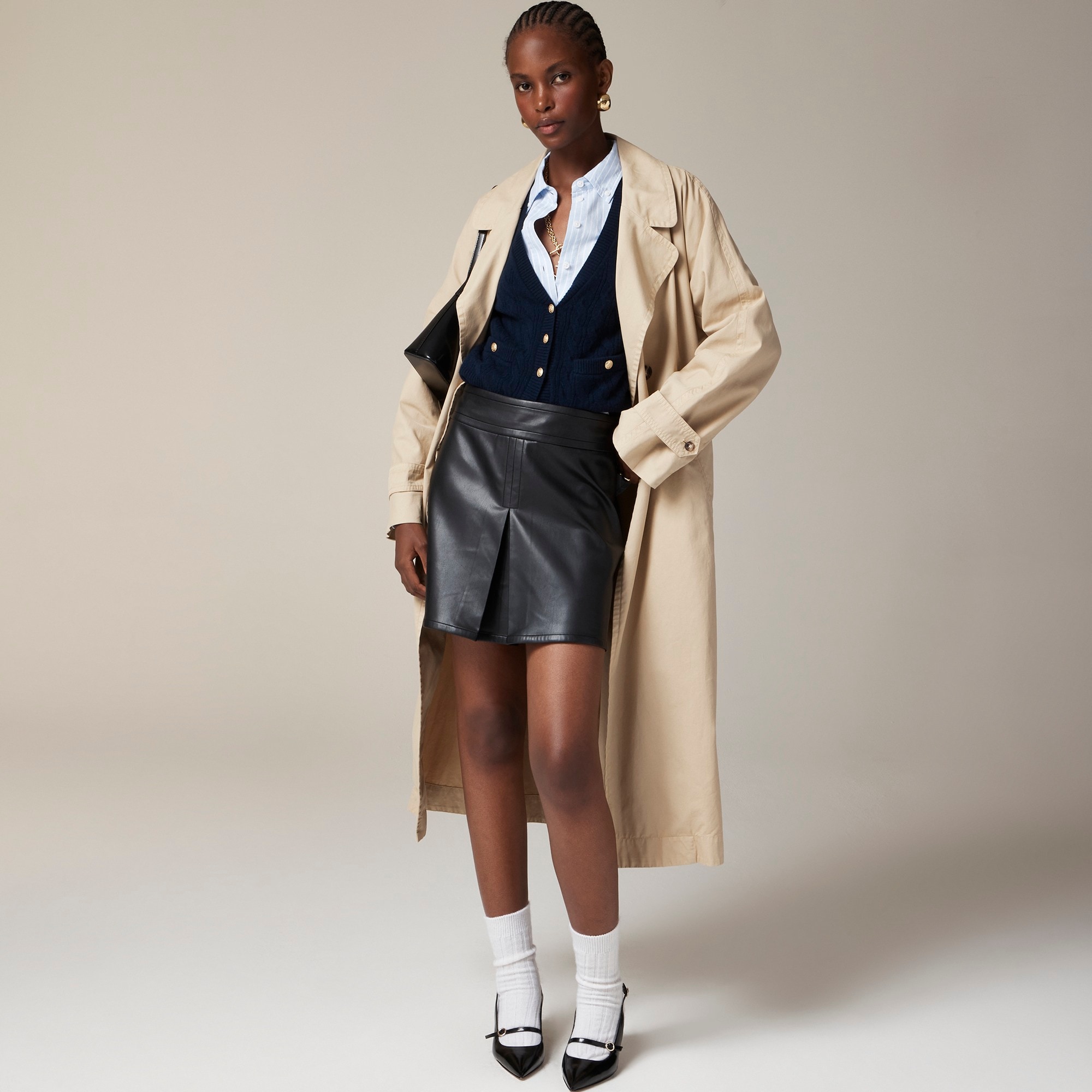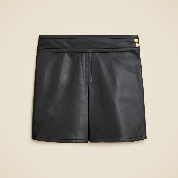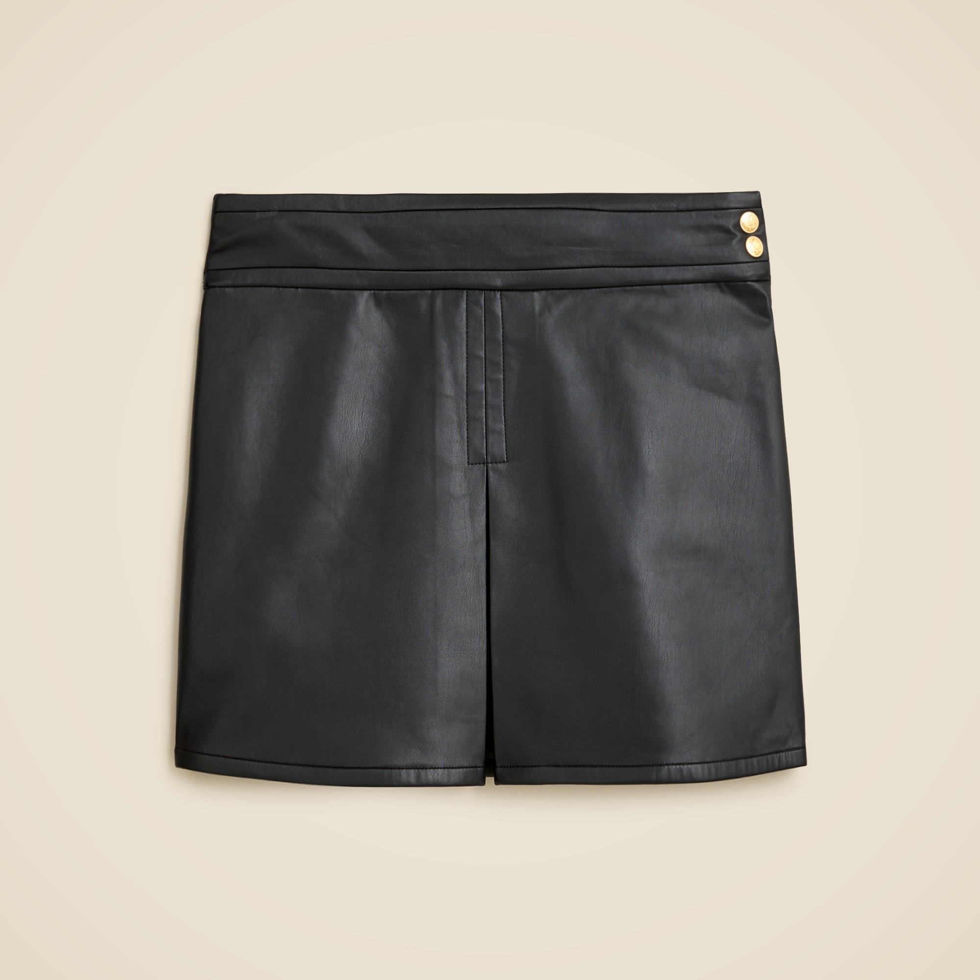 A made-for-today twist on the classic mini. This one comes with a unique inverted-pleat detail at the center that’s folded inwards, two gold crest buttons at the waist and a smooth faux leather finish for added polish.