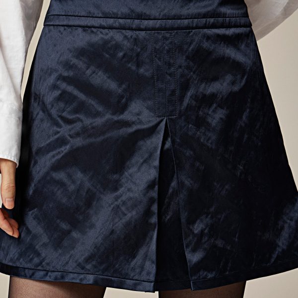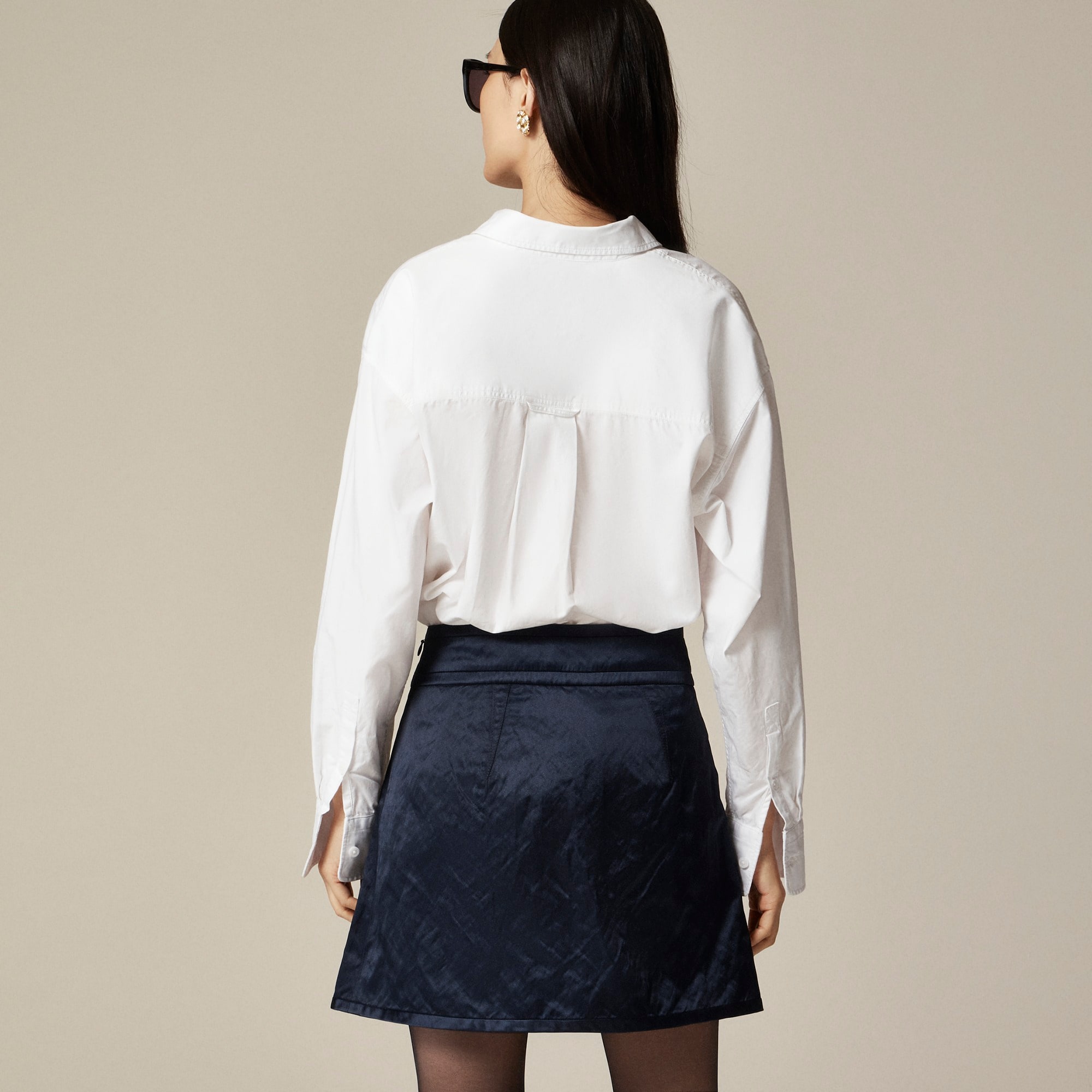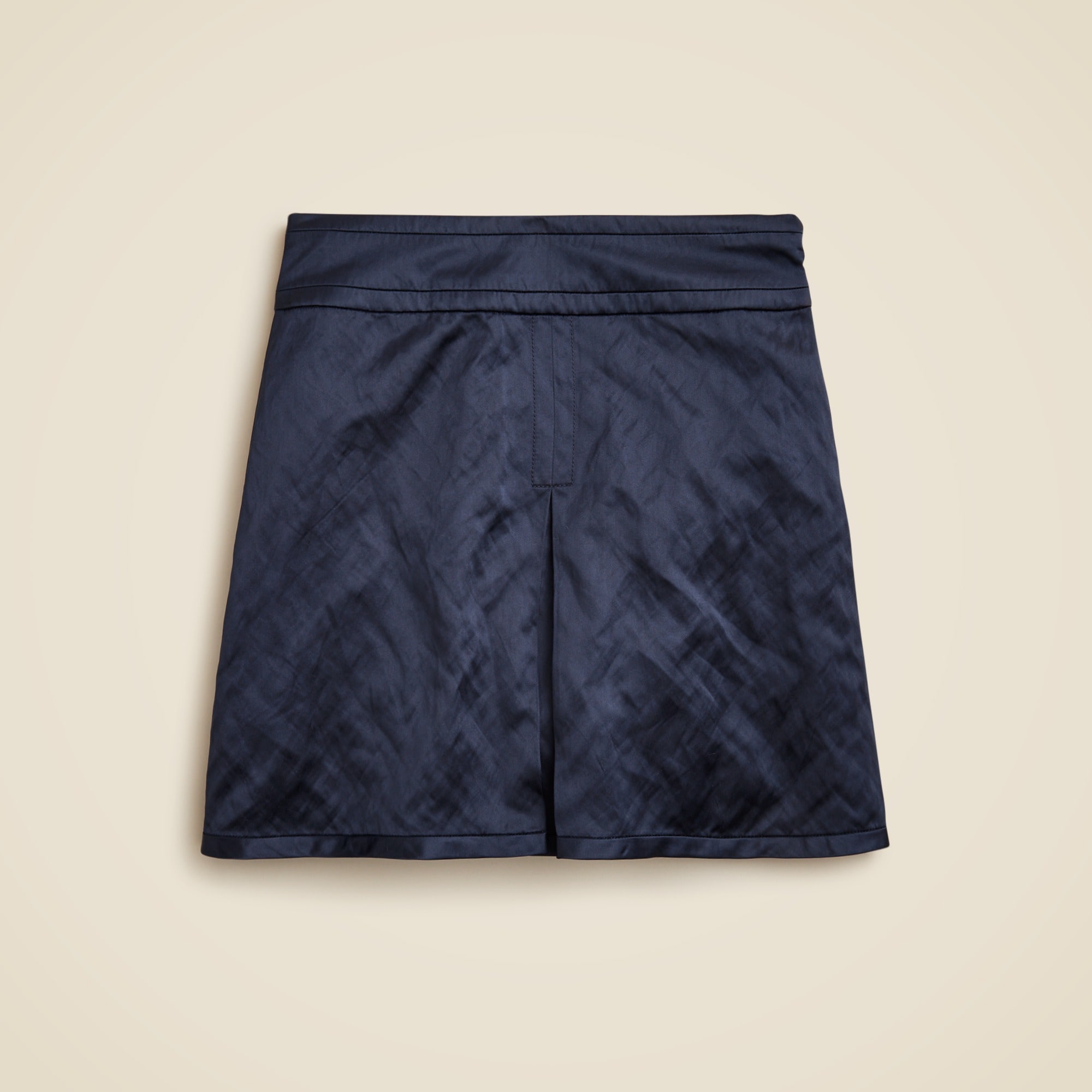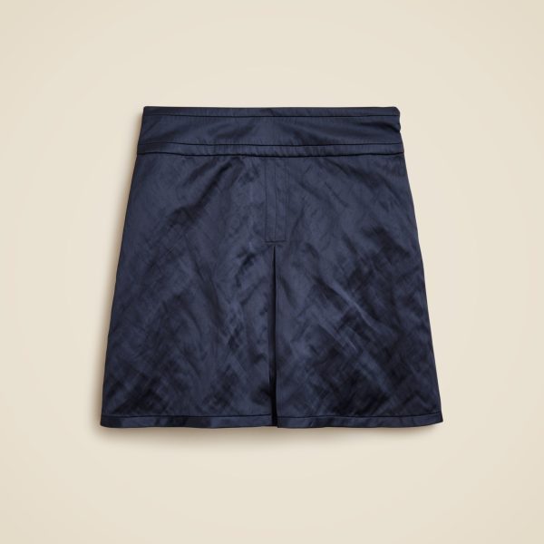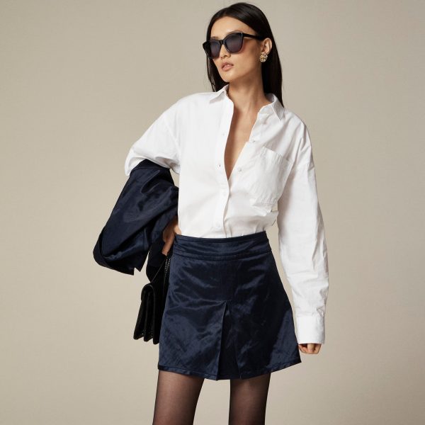 New in J.Crew Collection. A made-for-today twist on the classic mini with a unique inverted-pleat detail at the center that’s folded inward and two gold crest buttons at the waist. It’s crafted from our textured satin, which has a light-reflecting finish, plus a pre-crinkled look and feel. Pro tip: Pair it with the matching blazer for a sweet take on the suit.