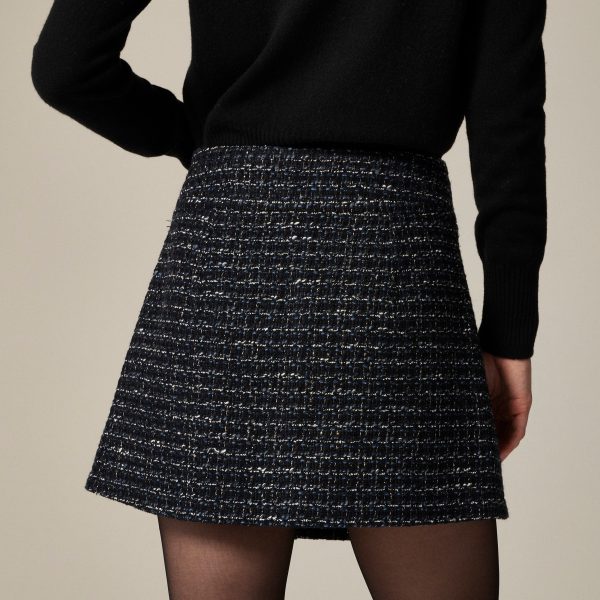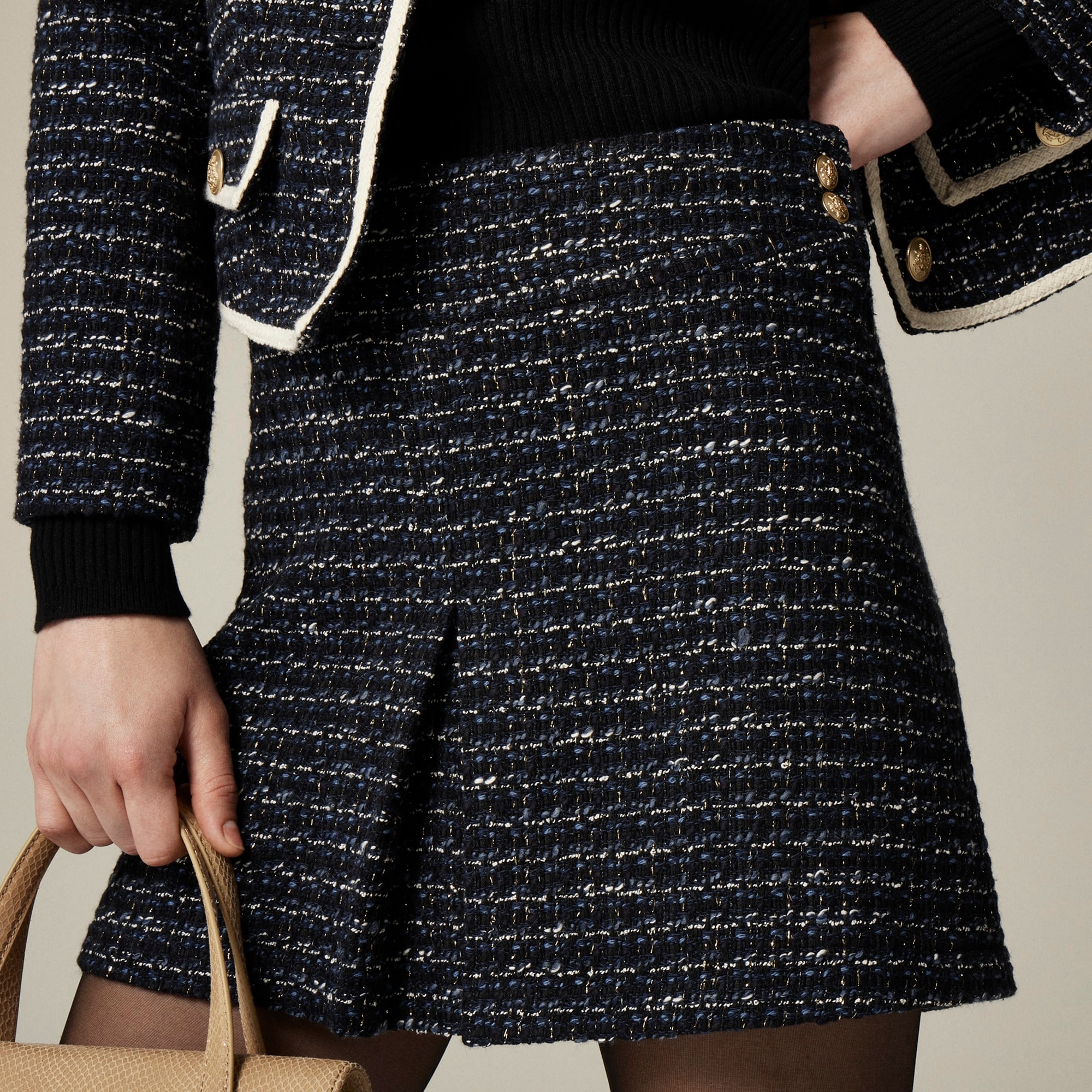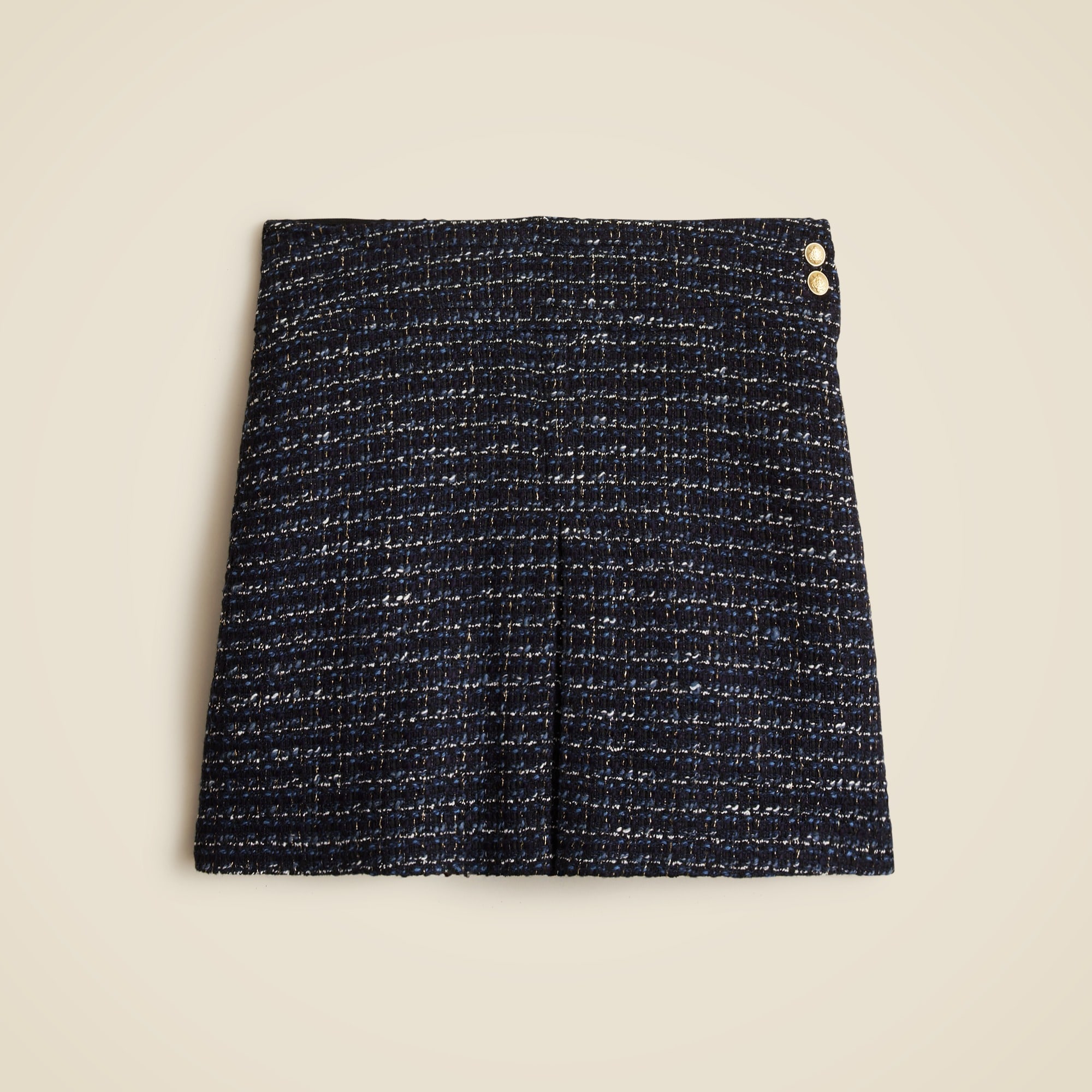 New in J.Crew Collection. A made-for-today twist on the classic mini with a unique inverted-pleat detail at the center that’s folded inward and two gold crest buttons at the waist. It’s crafted from textured, dimensional tweed that’s woven with blue, black and white thread. Pro tip: Pair it with the matching blazer for a modern take on the suit.