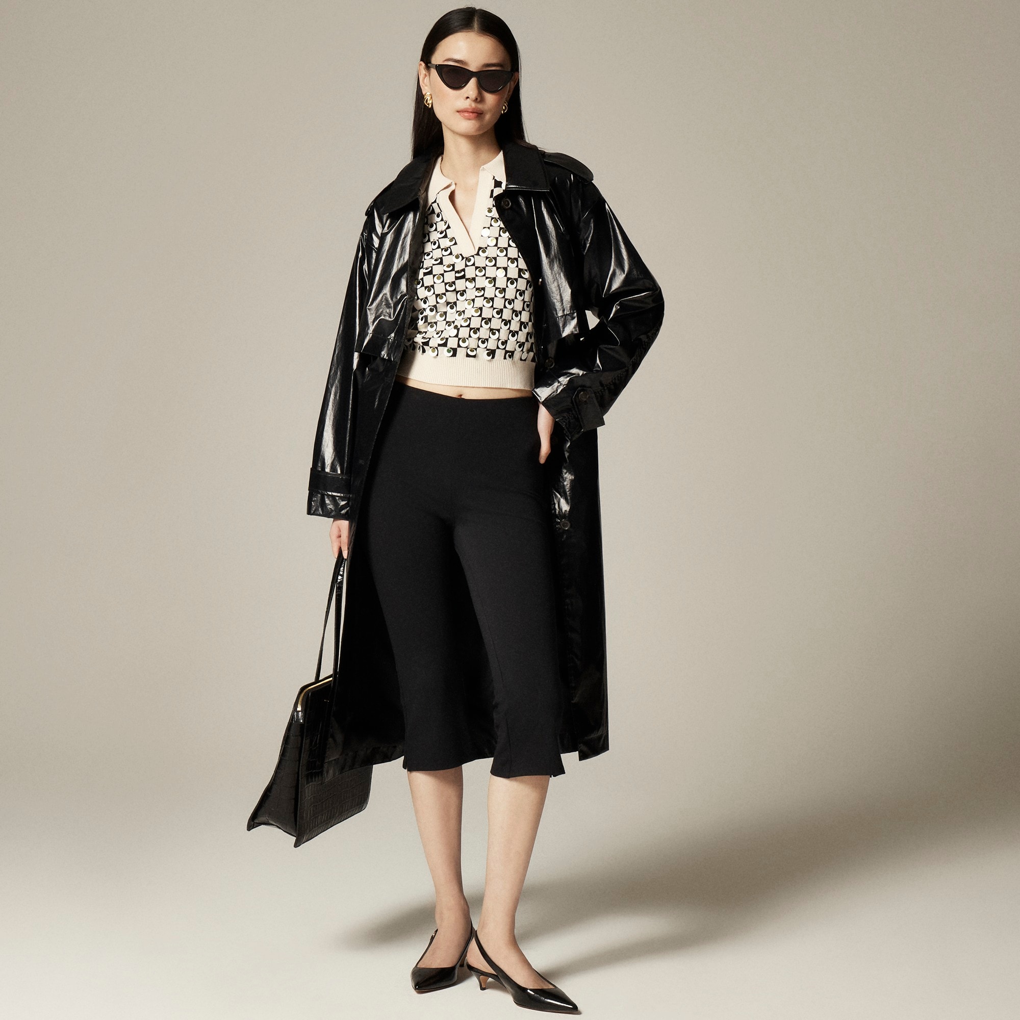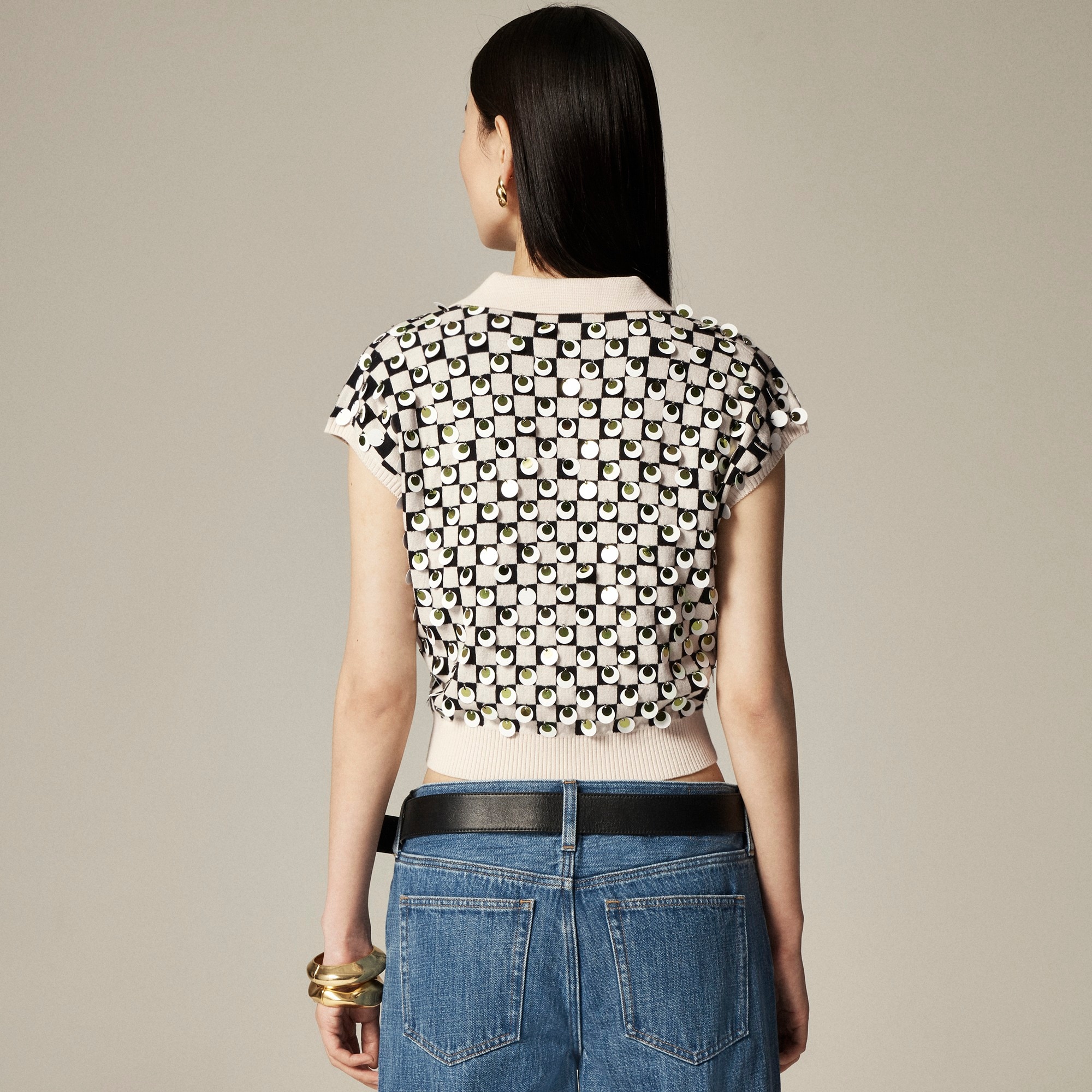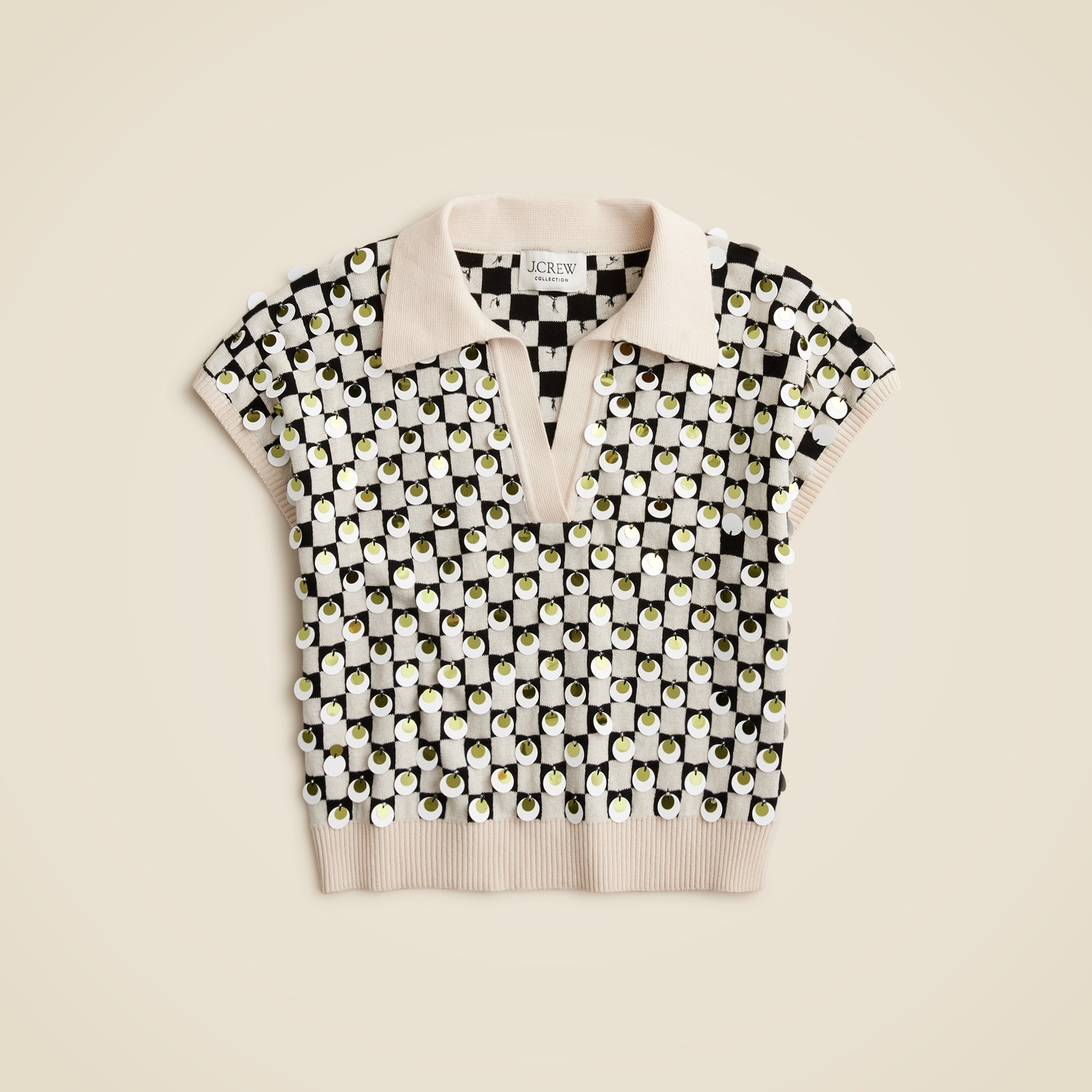 New in J.Crew Collection. This short-sleeve pullover comes with a layerable V-neck and a polished collar inspired by vintage polos. Plus, it’s knit in a retro checkerboard pattern and embellished by hand with circular, dual-tone paillettes that catch the light.