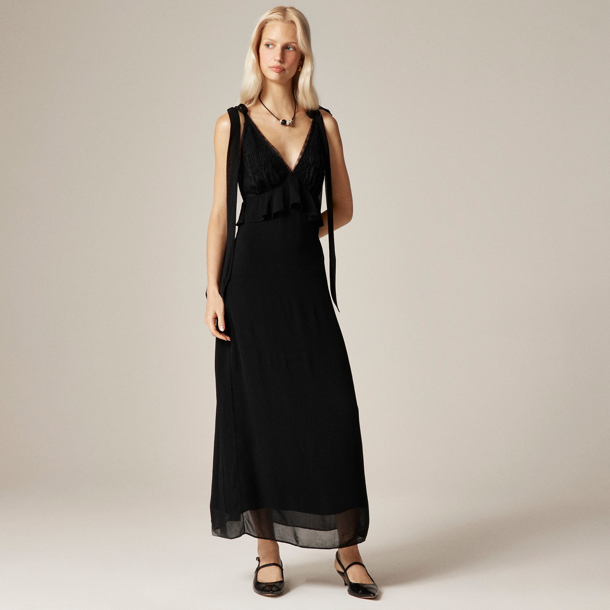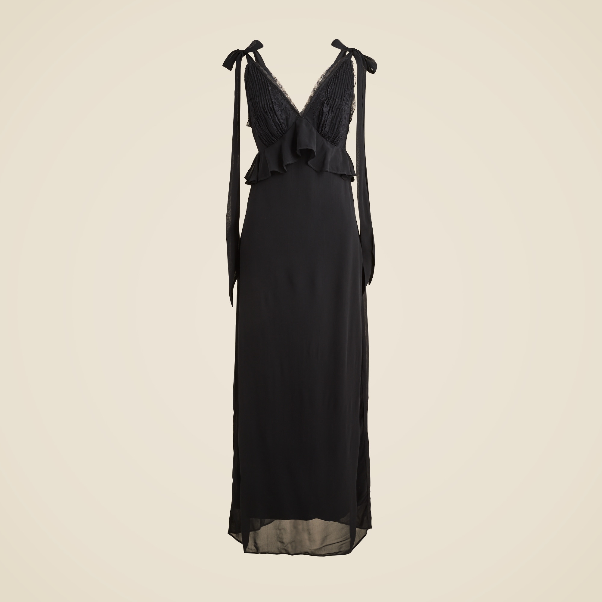 New in J.Crew Collection. Designed with delicate lace, ruffle accents and tie straps that can be worn in a bow, this slip silhouette is all about the details. Plus, it’s crafted from floaty, subtly sheer chiffon that adds lots of organic movement.