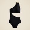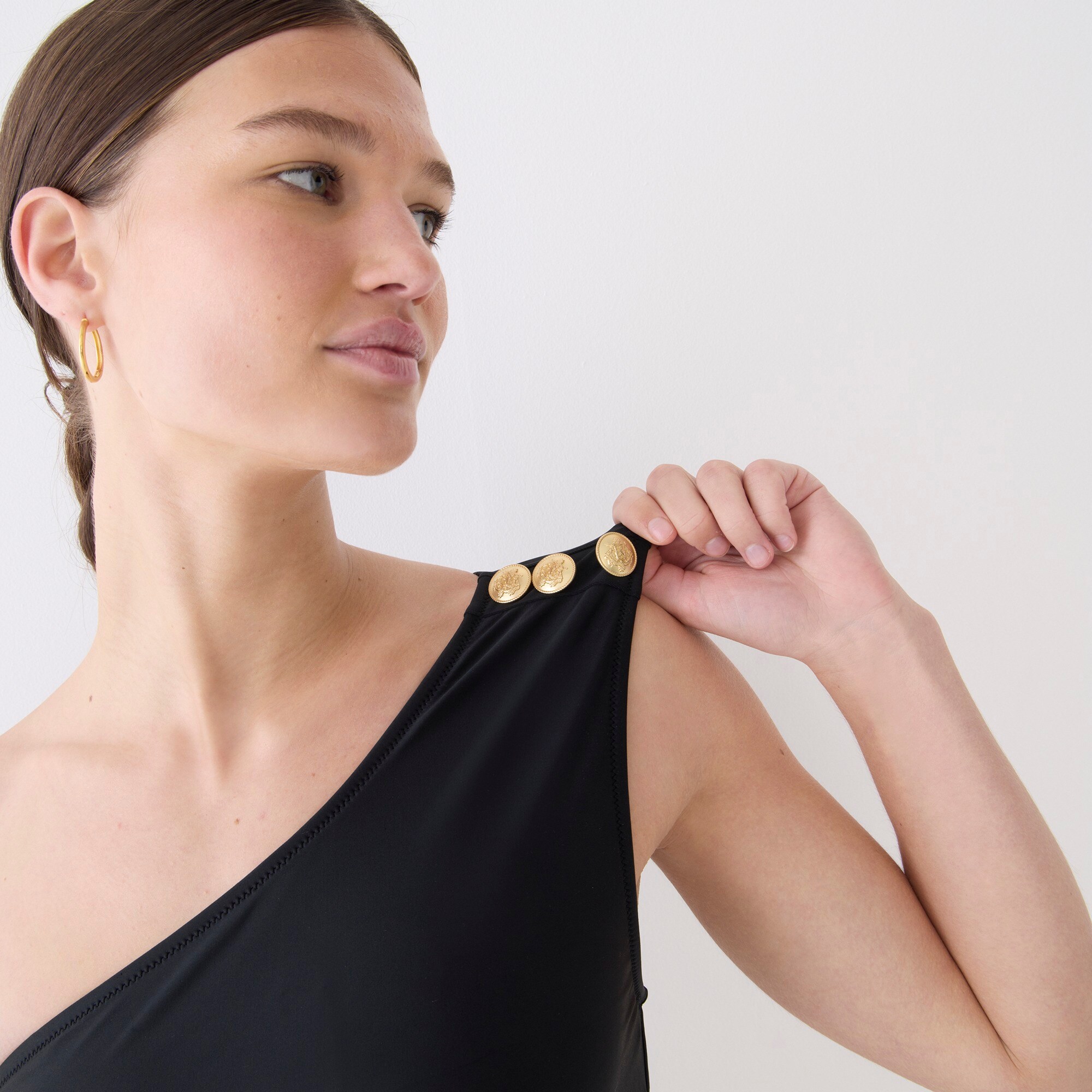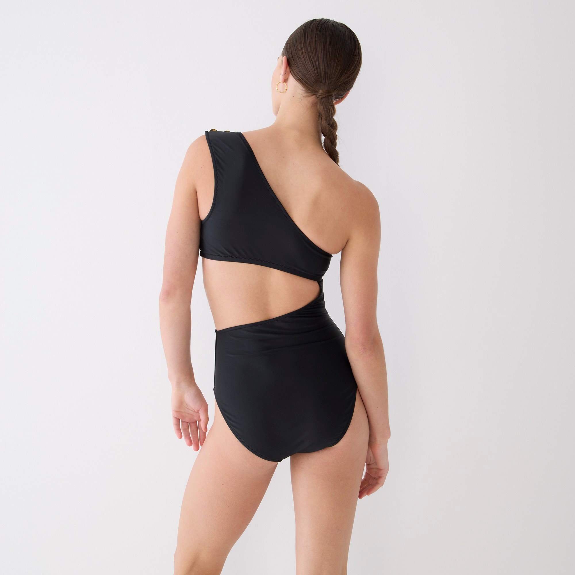 Like wearing a bikini, but with the coverage of a classic tank swimsuit, this cutout one-piece shows just enough skin without overdoing it. This piece also features a few gold-button details at the shoulder. Plus, it is crafted with nylon made from recycled materials that could otherwise go to landfills.