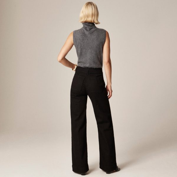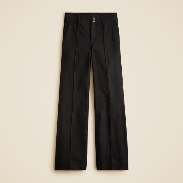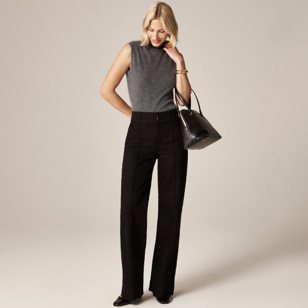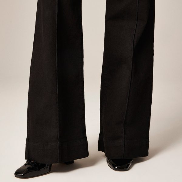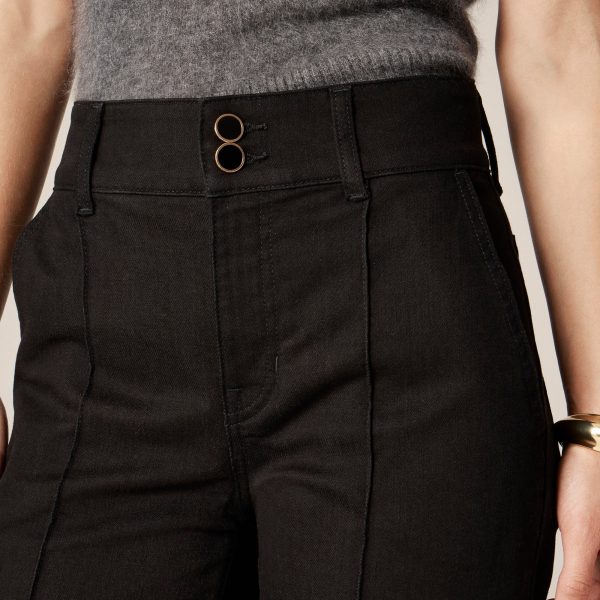 Our top-rated fit, with an extra-polished twist. This effortless everyday pair comes with an ultra-high rise that sits right above your natural waist and a wide-leg that’s fitted around the hips and gradually gets roomier. With a 31u0026quot; inseam, this pant grazes the floor in sneakers and can be paired with heels for a touch of drama. We added a flattering wider waistband with new black and goldu0026ndash;rimmed button details for that extra hint of refinement. Plus, these are crafted in semi-stretch, so they’re structured, durable and designed for all-day comfort.