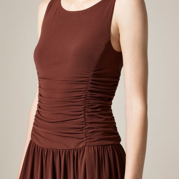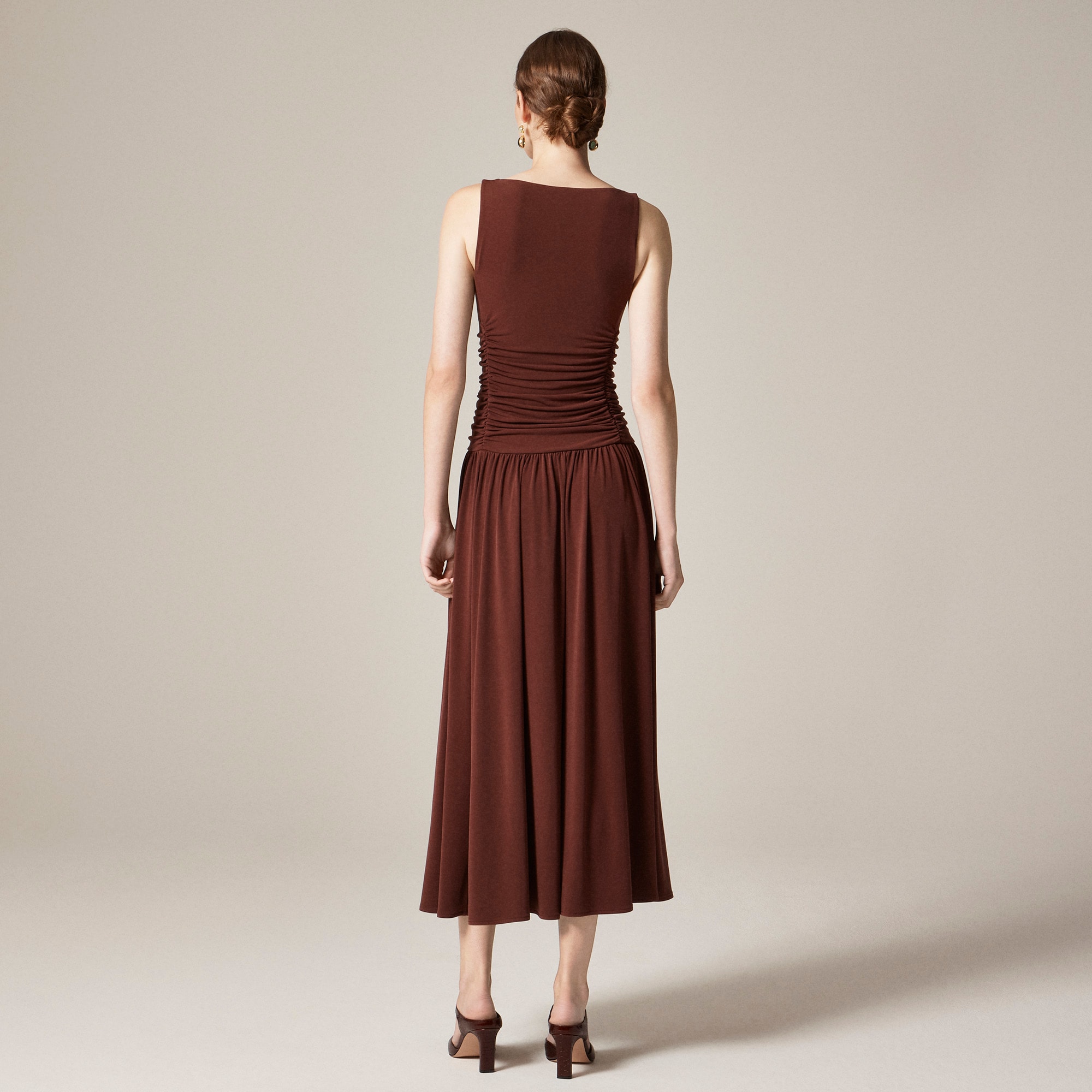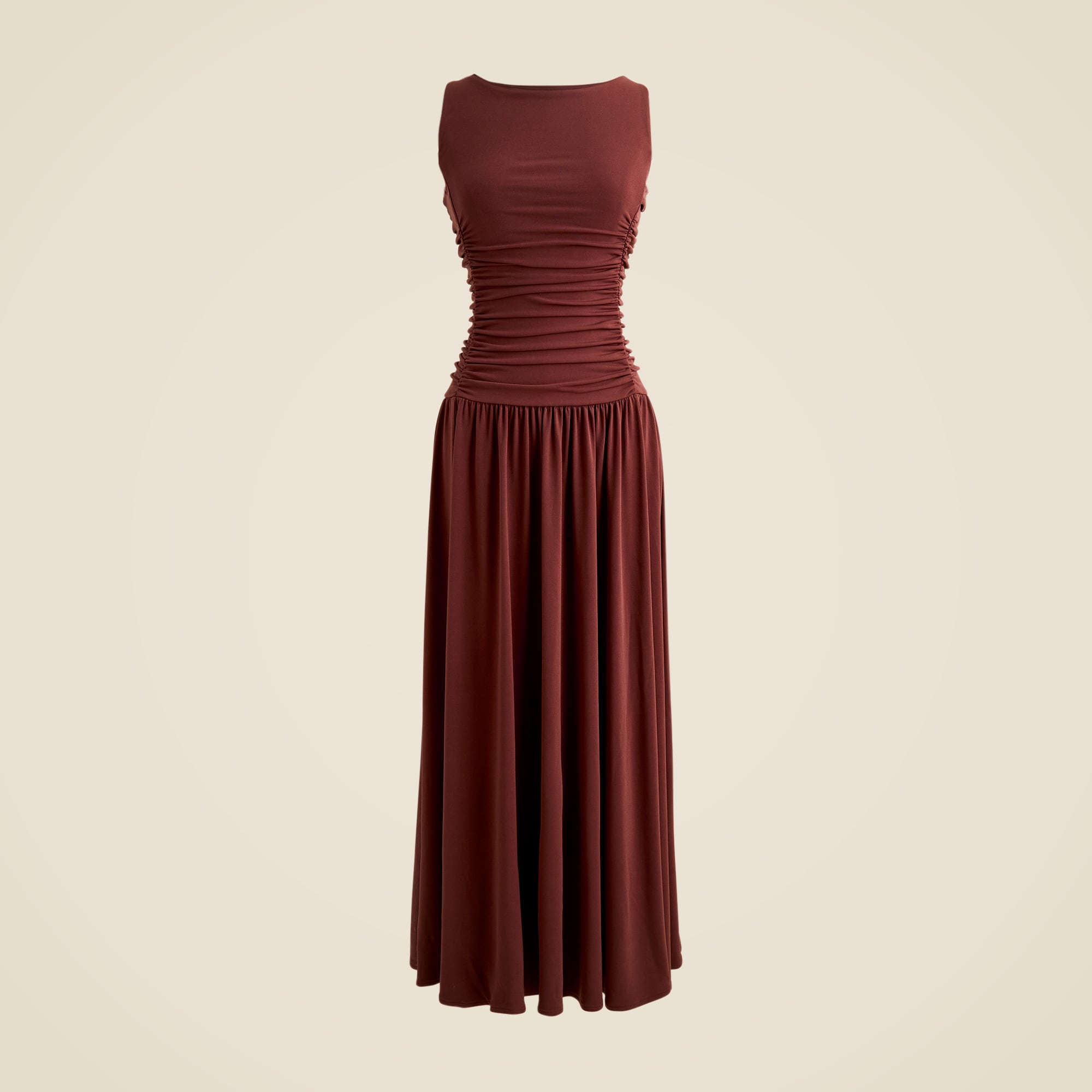 Easy drape, elevated shape. This deceptively simple style comes with a true drop-waist detail, flattering side ruching and a refined bateau neckline. Plus, it’s crafted in soft, stretchy matte jersey that skims the body.