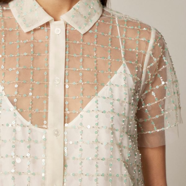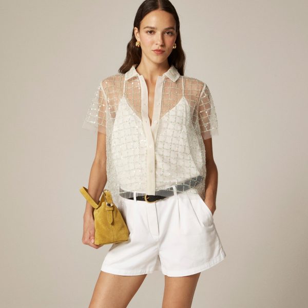Our customer-favorite shirt fitu0026mdash;embellished. This sheer button-up pairs a tailored silhouette with an allover grid of sequins for just the right amount of shine. Layered over a matching camisole, it balances playful sparkle with a polished finishu0026mdash;perfect for dressing up denim or adding sparkle under blazers.