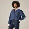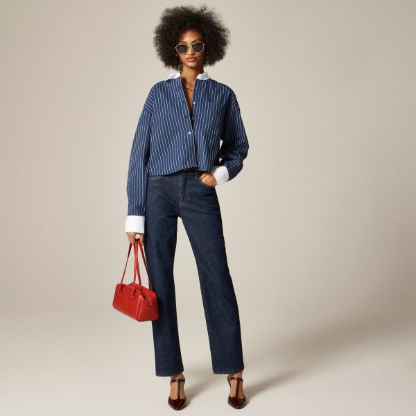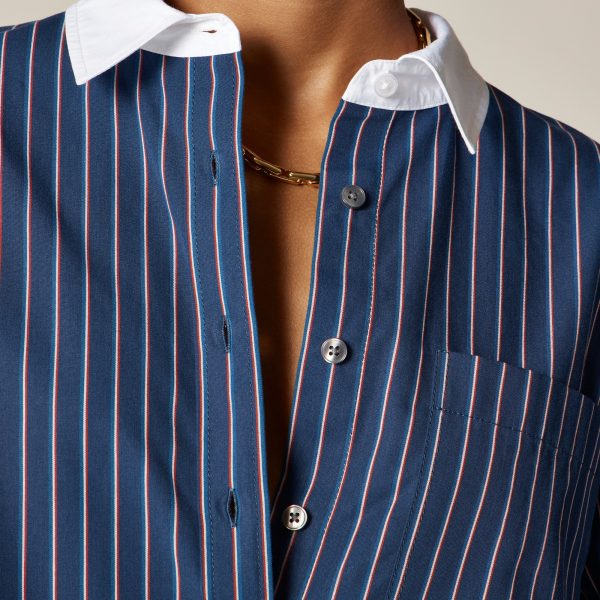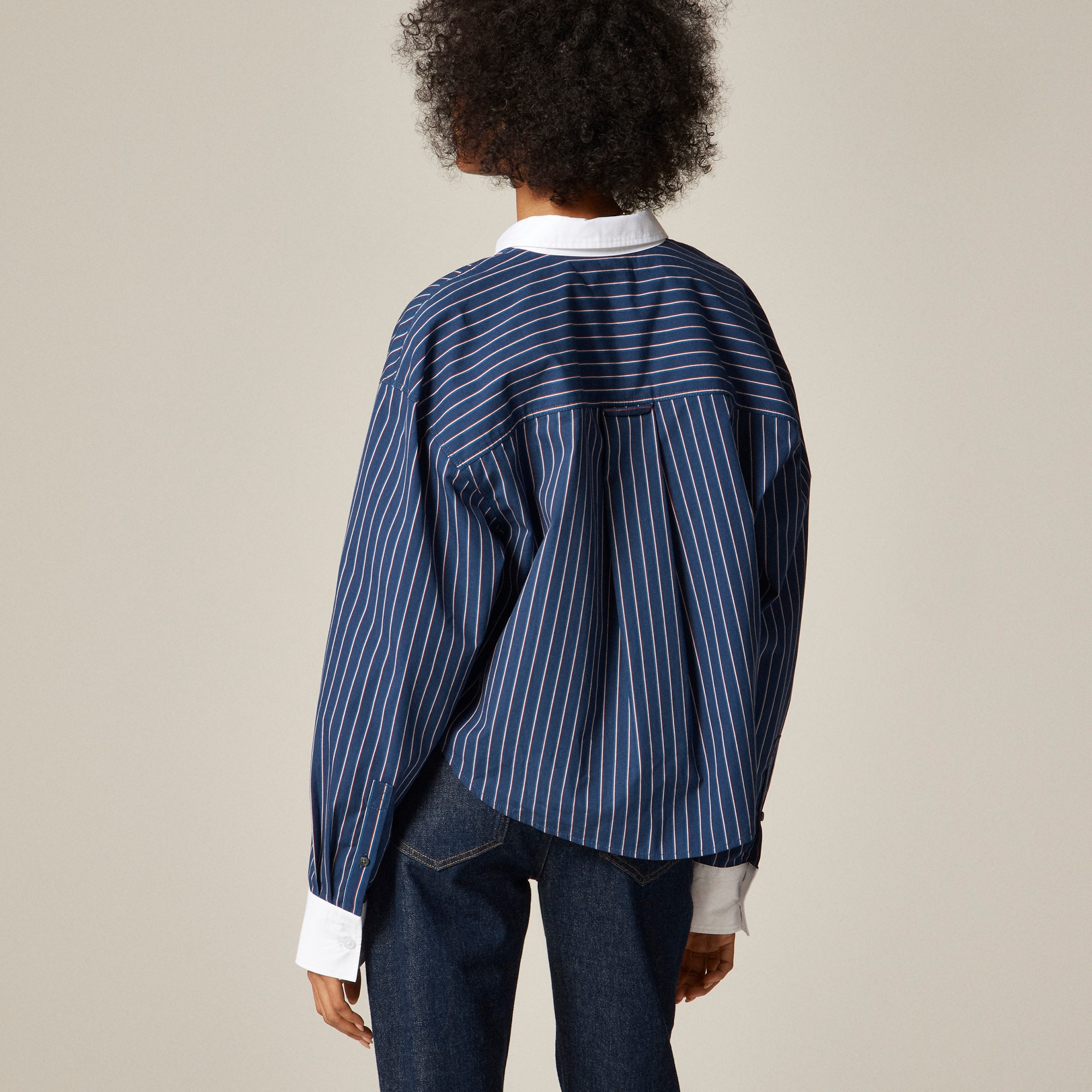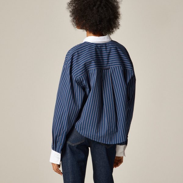 Everyone’s favorite oversized shirt, in a new cropped fit. Relaxed and effortless, it has a menswear-inspired feel and a high-low shirttail hem for a hint of drama. This version dresses things up with a contrast collar and sleeve cuffs.