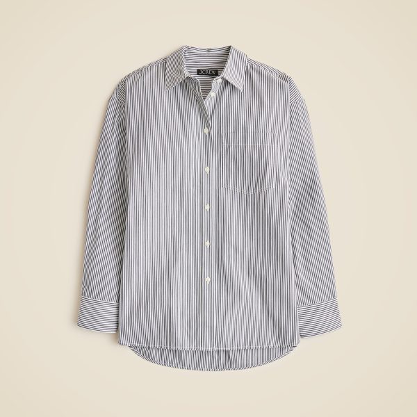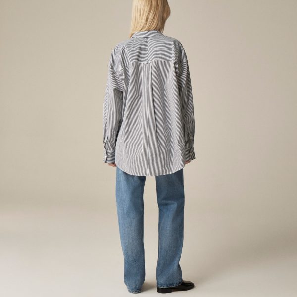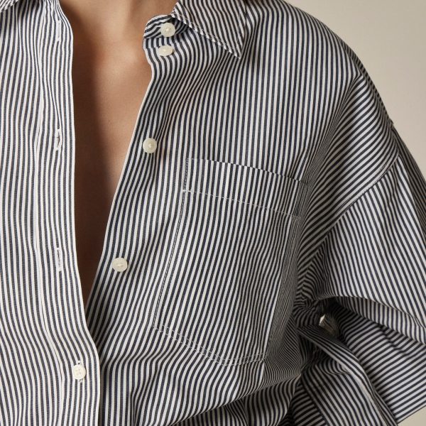 Our roomiest proportion to date with a longer length. Ultra-relaxed and effortless, it has a menswear-inspired feel and a high-low shirttail hem for a hint of drama. This version is crafted in a striped version of our crisp cotton poplin fabric that we love.