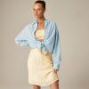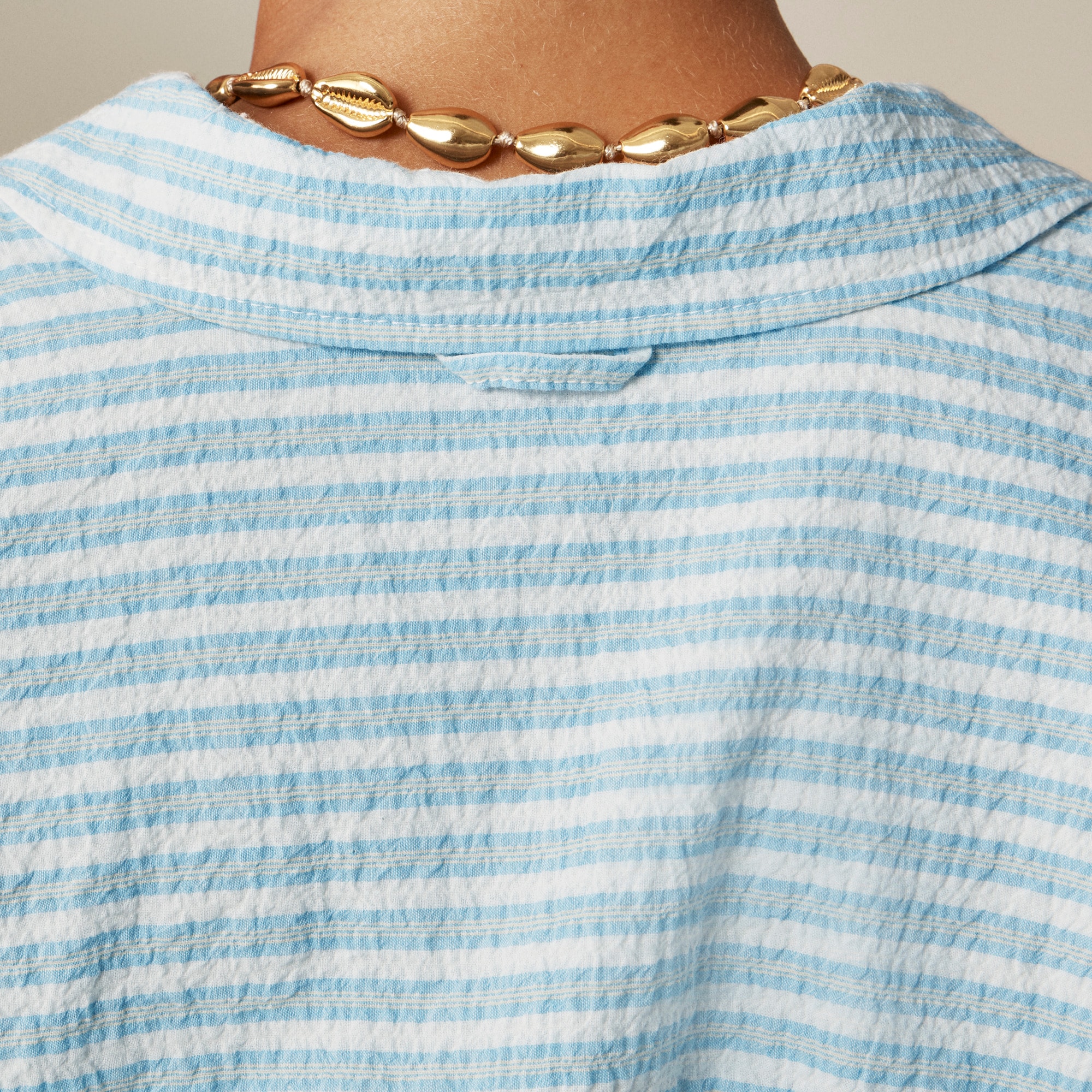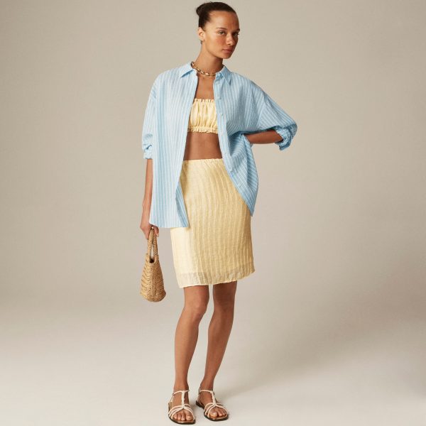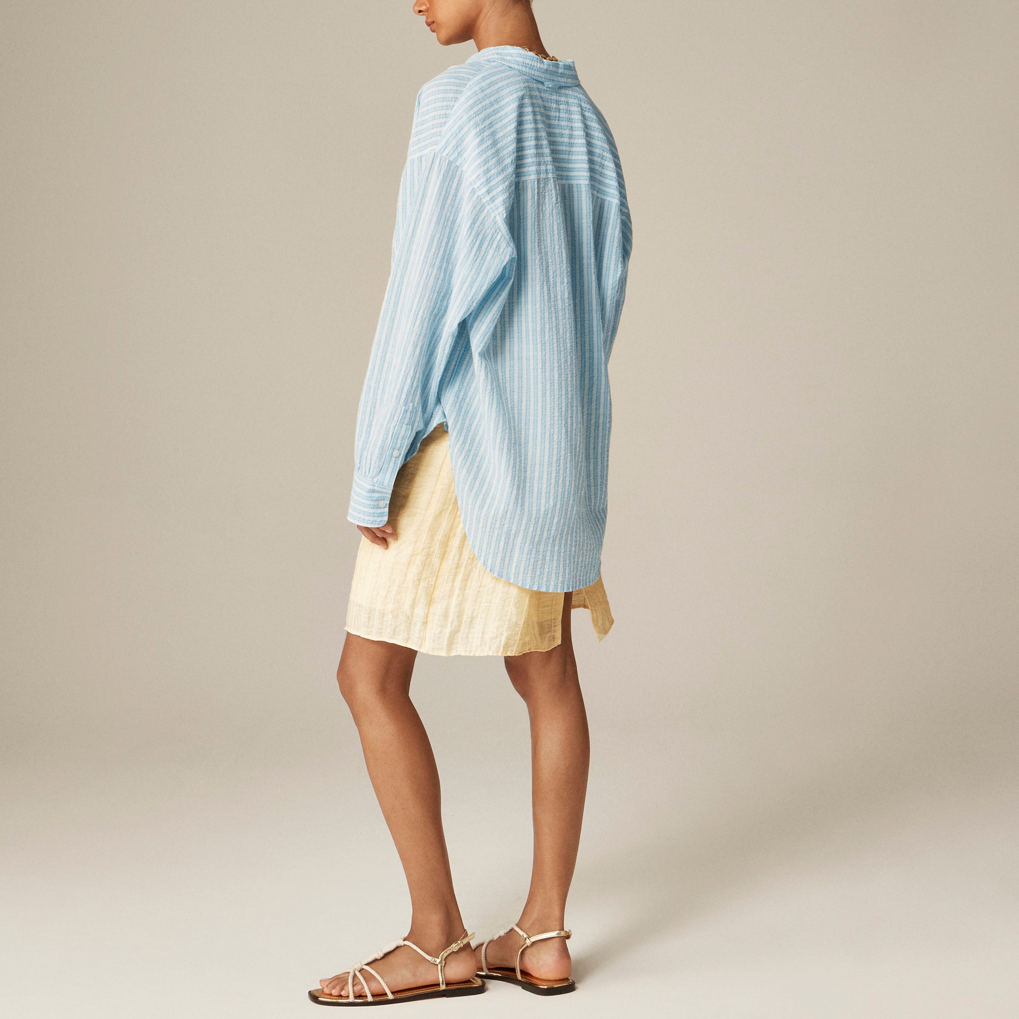 Our roomiest proportion to date with a longer length. Ultra-relaxed and effortless, it has a menswear-inspired feel and a high-low shirttail hem for a hint of drama. This version is striped and crafted in a cotton-blend poplin fabric that’s subtly crinkled (so it looks best with a few wrinkles.)