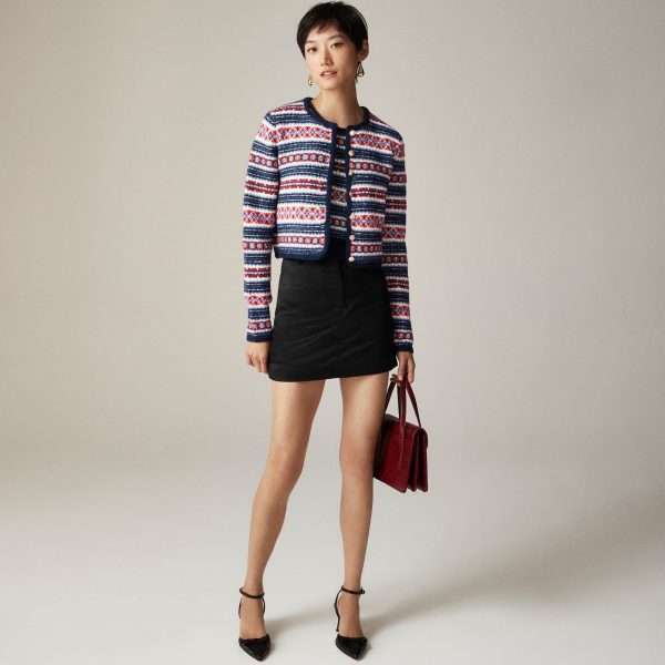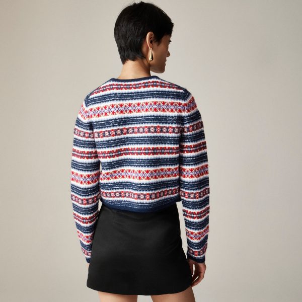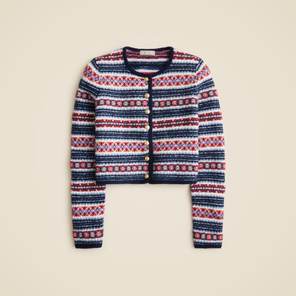 Soft, luxe and subtly oversized . .An easy-yet-elevated take on our signature sweater lady jackets, knit from a textured, heavier-weight bouclu0026eacute; yarn in a vintage-inspired Fair Isle pattern. It has a slightly cropped length and a relaxed look, thanks to the drop-shoulder detail. Plus, it’s crafted from super-cozy boiled wool (translation: it’s tightly woven for major warmth and less bulk). Pro tip: It pairs perfectly with the matching sweater vest for a sweet set.