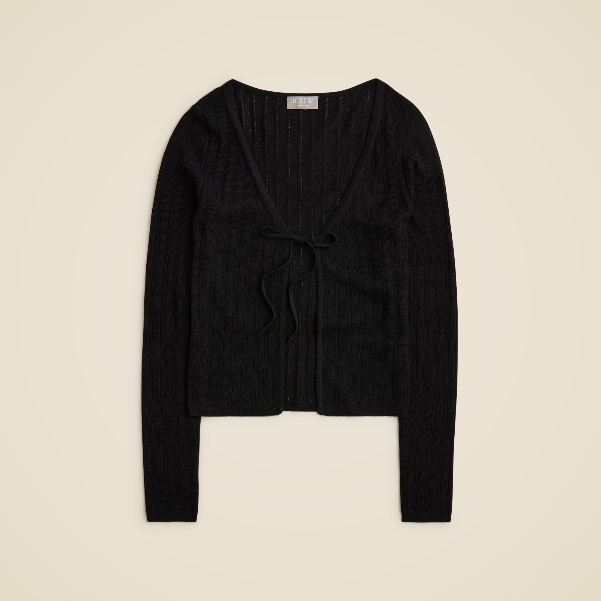 The sweetest layer you’ll wear all season. This open-front cardigan lets your first layer peek through, with a tie detail up top that can be worn in a bow. Spun from soft 100 percent cashmere that’s lighter than air and ultrasmooth, with delicate pointelle stitching. In other words, it’s the perfect last layer for the spring and summer months. We’re proud to support responsible cashmere production through our partnership with the Aid by Trade Foundation (AbTF), a nonprofit that promotes sustainable agricultural development across the globe. We source cashmere that is certified to the AbTF’s The Good Cashmere Standardu0026reg;, which ensures the welfare of the cashmere goats, protects natural resources and improves the working conditions of farmers and farmworkers in Inner Mongolia.
