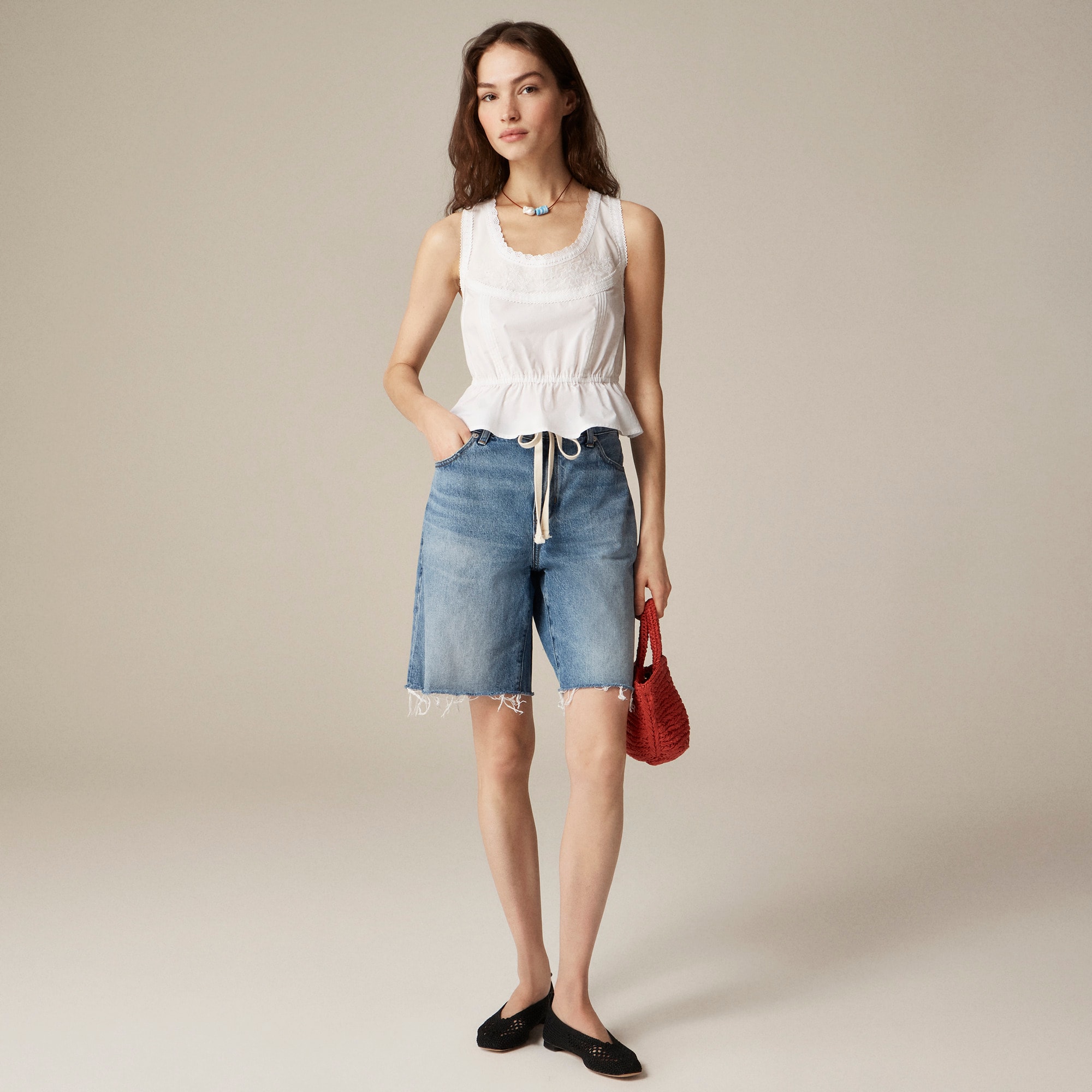 A detail-oriented style that sums up summer. It comes with pretty lace trim up top, floral embroidery and an elastic waist that releases into a peplum-style hem. Pro tip: Pair it with the matching short for your easiest warm-weather outfit.