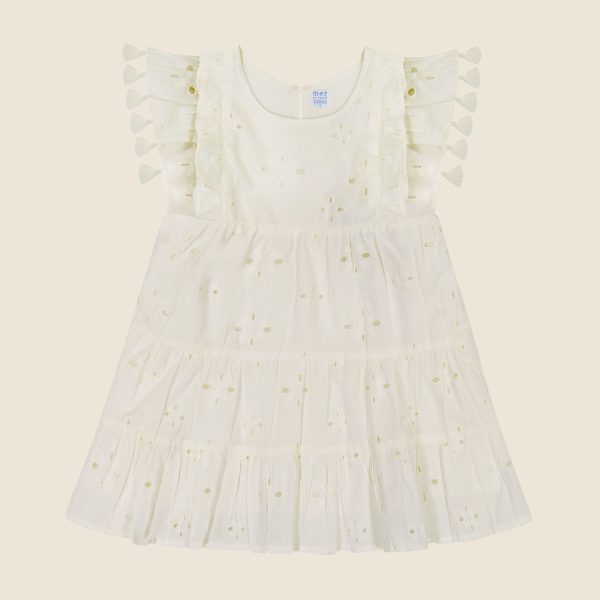 Mer St. Barth is a collection of dresses and cover-ups for mothers and daughters inspired by the island of St. Barth. Beloved Sophie tassel dress features a scoop neckline, a row of tassels at the sleeves and a tiered, twirly skirt. Single button closure at back. Fully lined.