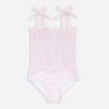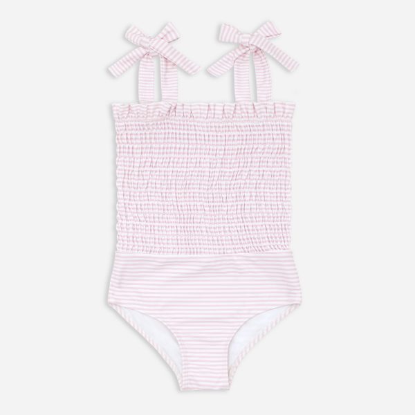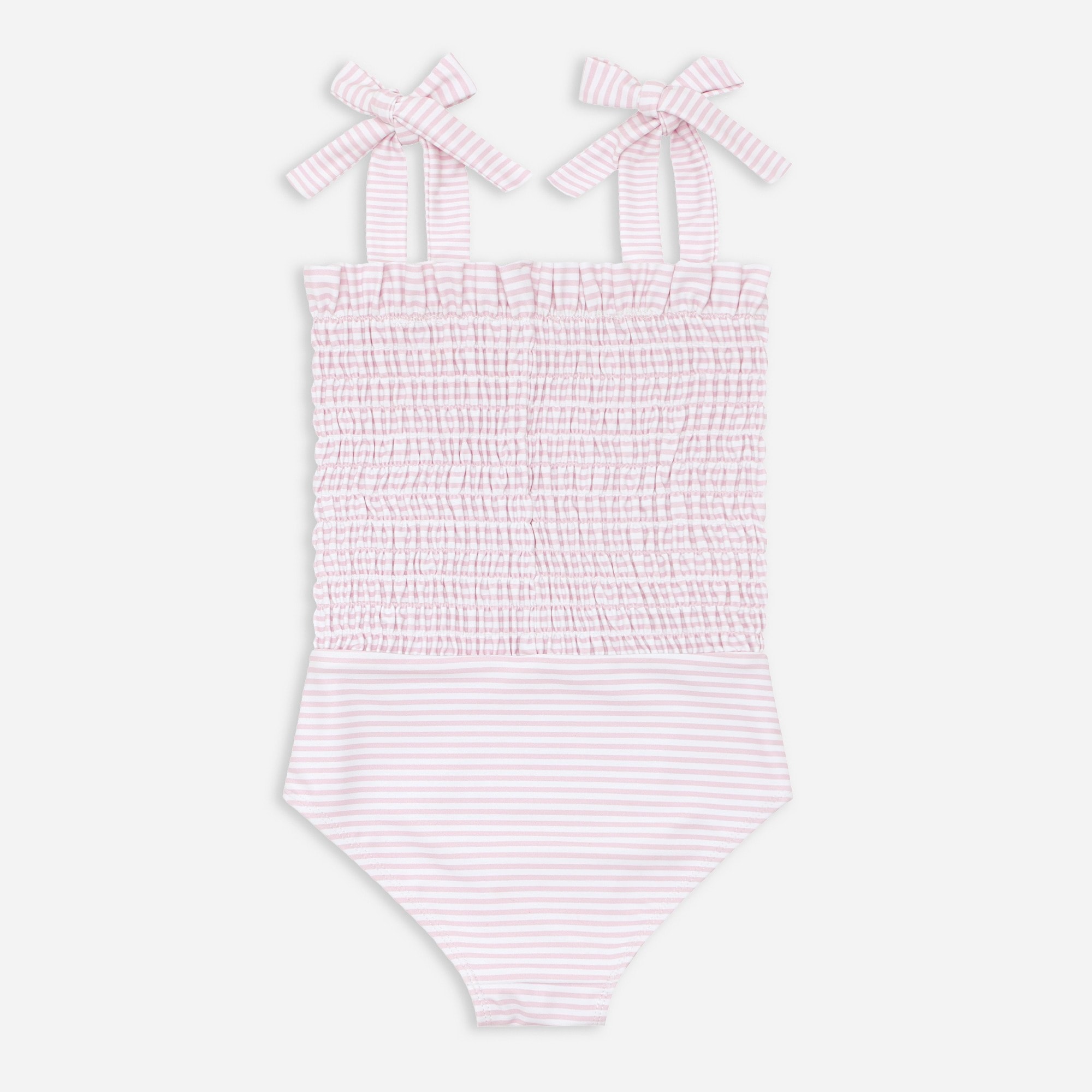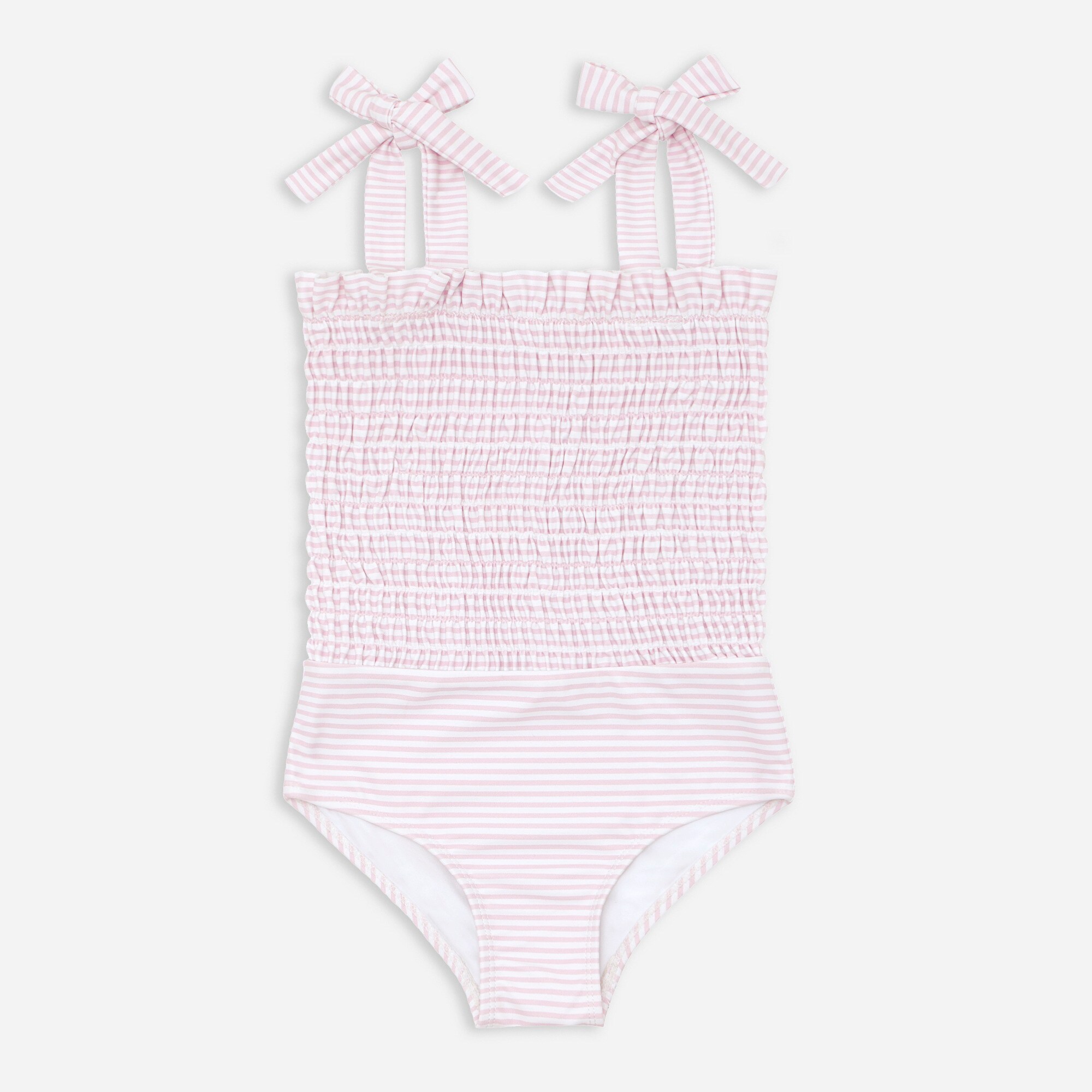 This childrenu0026apos;s swimwear label takes its cues from easy, breezy beachside style – think timeless pieces with a modern twist (hello, custom prints and hand-finished details). One of our favorite girlsu0026apos; silhouettes, featuring thoughtful smocked details on a one-piece maillot. Equal parts chic and sweet, this suit has a ruffle neckline with self straps. Ready for fun in the sun! Note: We strongly advise against using aerosol sunscreens, which contain chemicals that may stain suits.