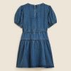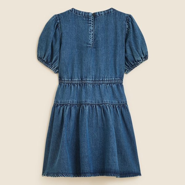 For the first day of school and beyond… This puff-sleeve dress with bow details is made from Mom’s drapey denim fabric, which has the classic look of denim without any of the stiffness. (In other words, it’s totally jean-ious.)