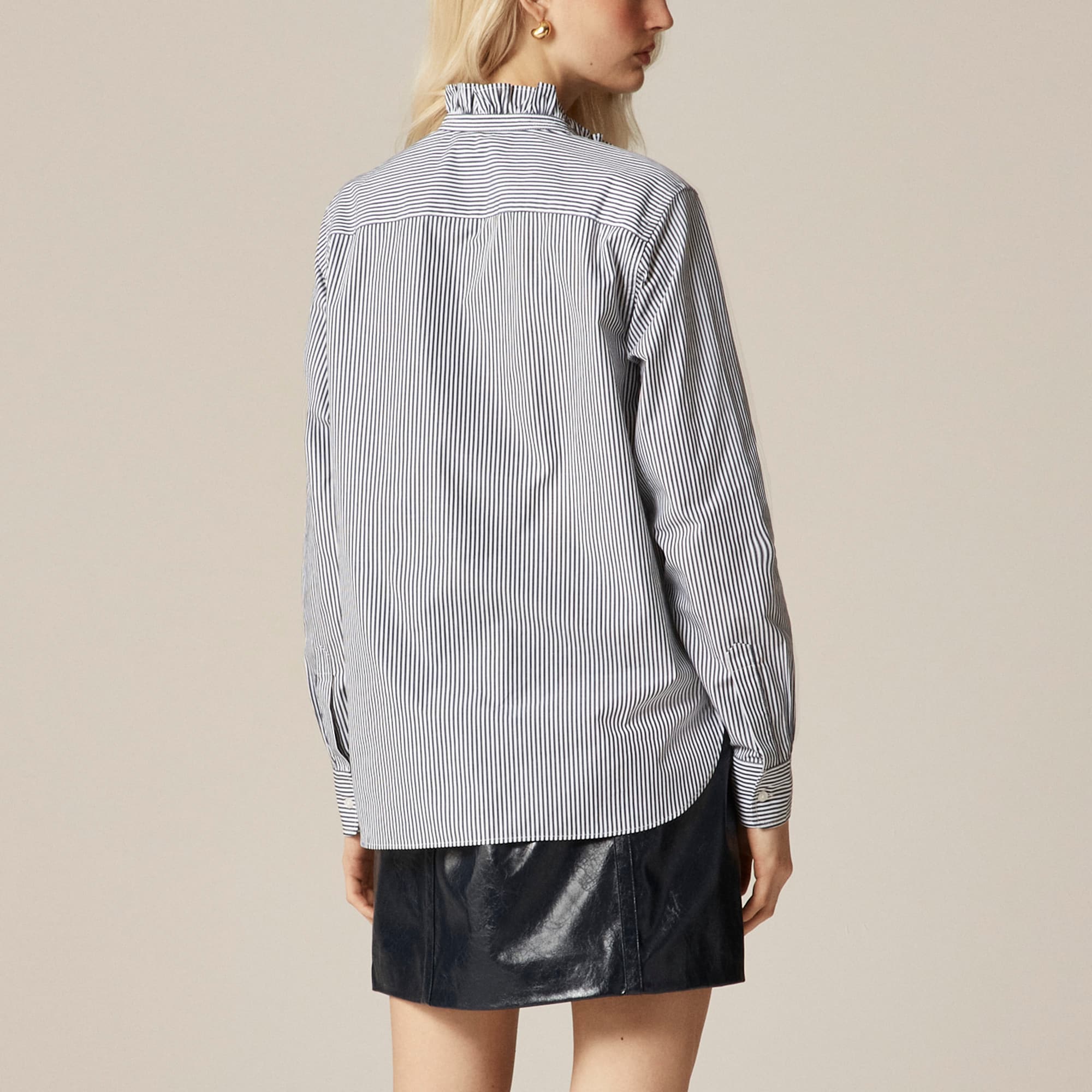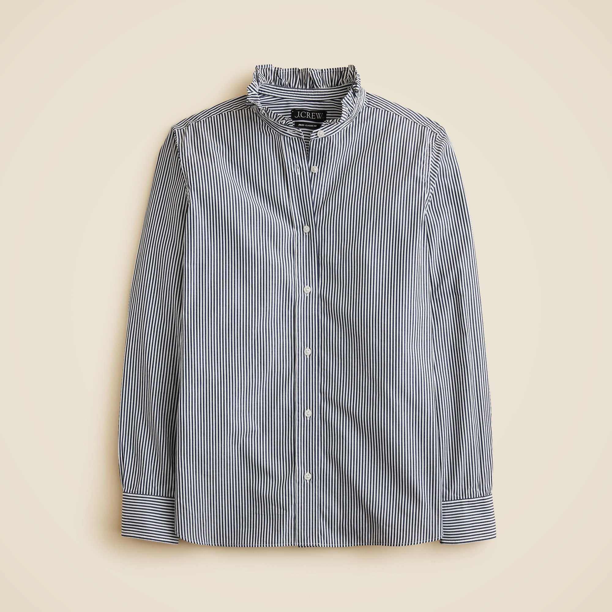 We made the ideal button-up. . .Our design team spent months fine-tuning this new fit. It’s cut in a classic silhouette (similar to our Garu0026ccedil;on shirt), with slimmer sleeves for an elegant, modern shape that layers effortlessly under blazers and sweaters. Made from our crisp, customer-favorite cotton poplin, it’s equal parts comfortable and refinedu0026mdash;and feels like it was tailored just for you. This version also comes with ruffle-trim details along the collar for an extra hint of sweetness.