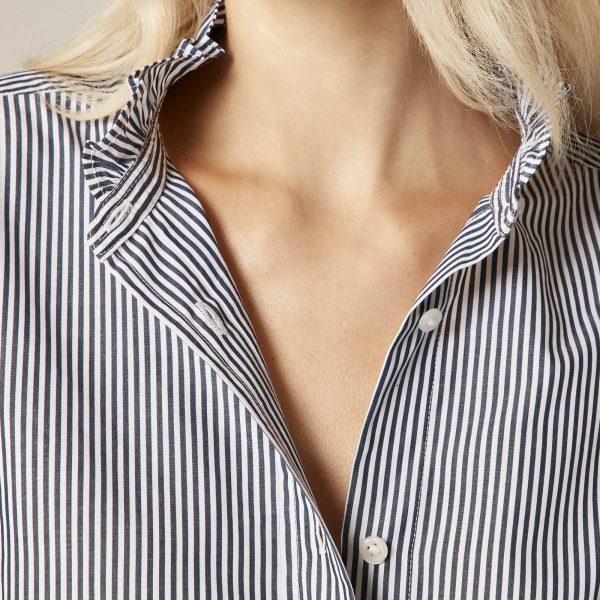 We made the ideal button-up. . .Our design team spent months fine-tuning this new fit. It’s cut in a classic silhouette (similar to our Garu0026ccedil;on shirt), with slimmer sleeves for an elegant, modern shape that layers effortlessly under blazers and sweaters. Made from our crisp, customer-favorite cotton poplin, it’s equal parts comfortable and refinedu0026mdash;and feels like it was tailored just for you. This version also comes with ruffle-trim details along the collar for an extra hint of sweetness.