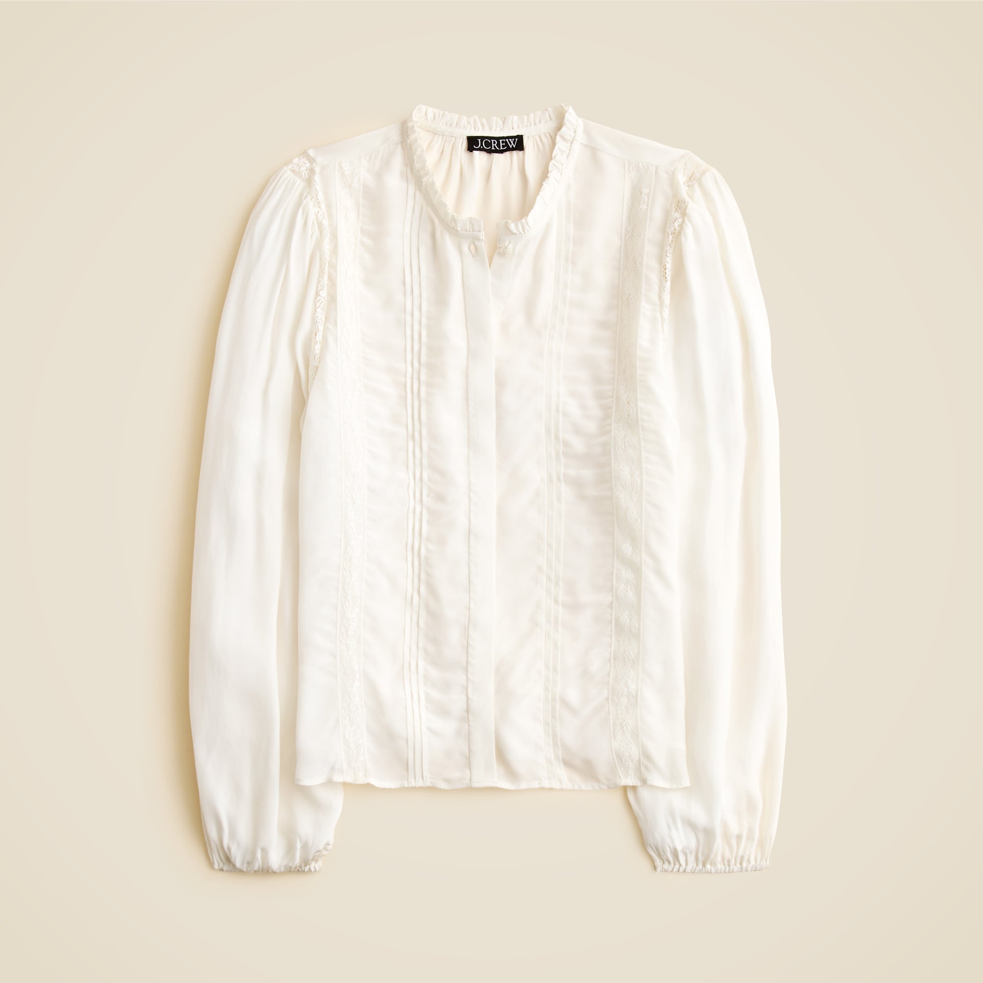 A little extra detail goes a long way. This breezy style comes with intricate lace panels along the arms, pretty pintucks up front and a ruffle-trim neckline. Plus, it’s crafted from our crepe de chine, which is incredibly smooth, soft and light on the body.