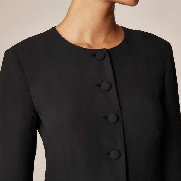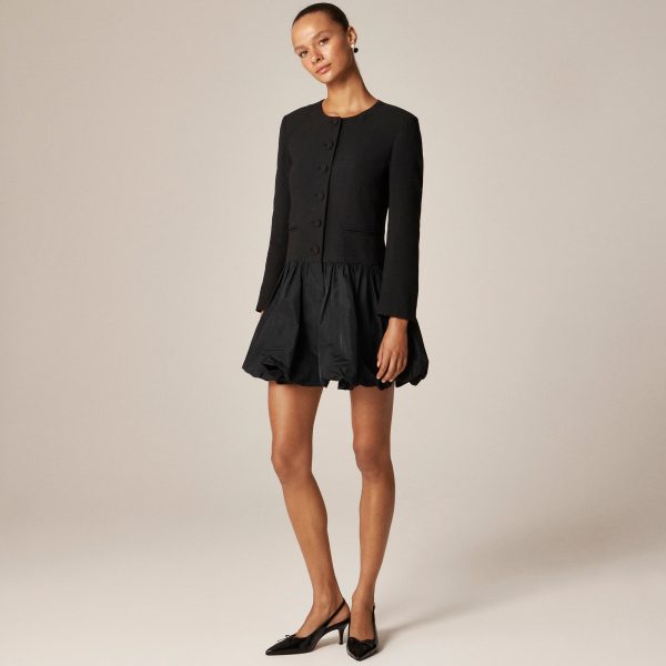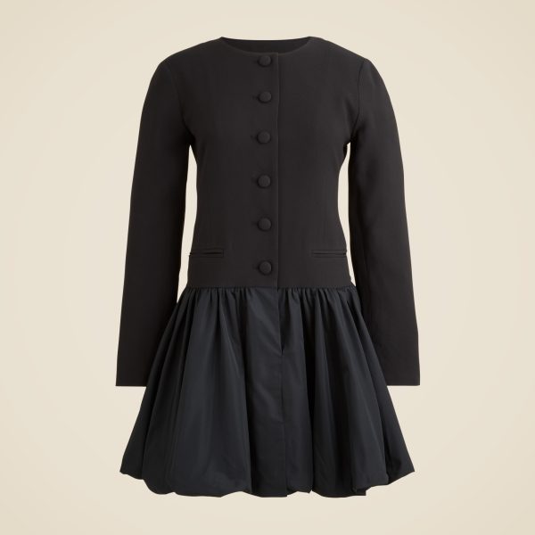 Best of both worlds. This hybrid style has a sleek crepe bodice up top with covered button details and a taffeta bubble skirt on the bottom that adds sculptural volume and movement. The result? A modern mini that’s made to stand out.