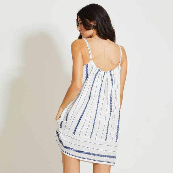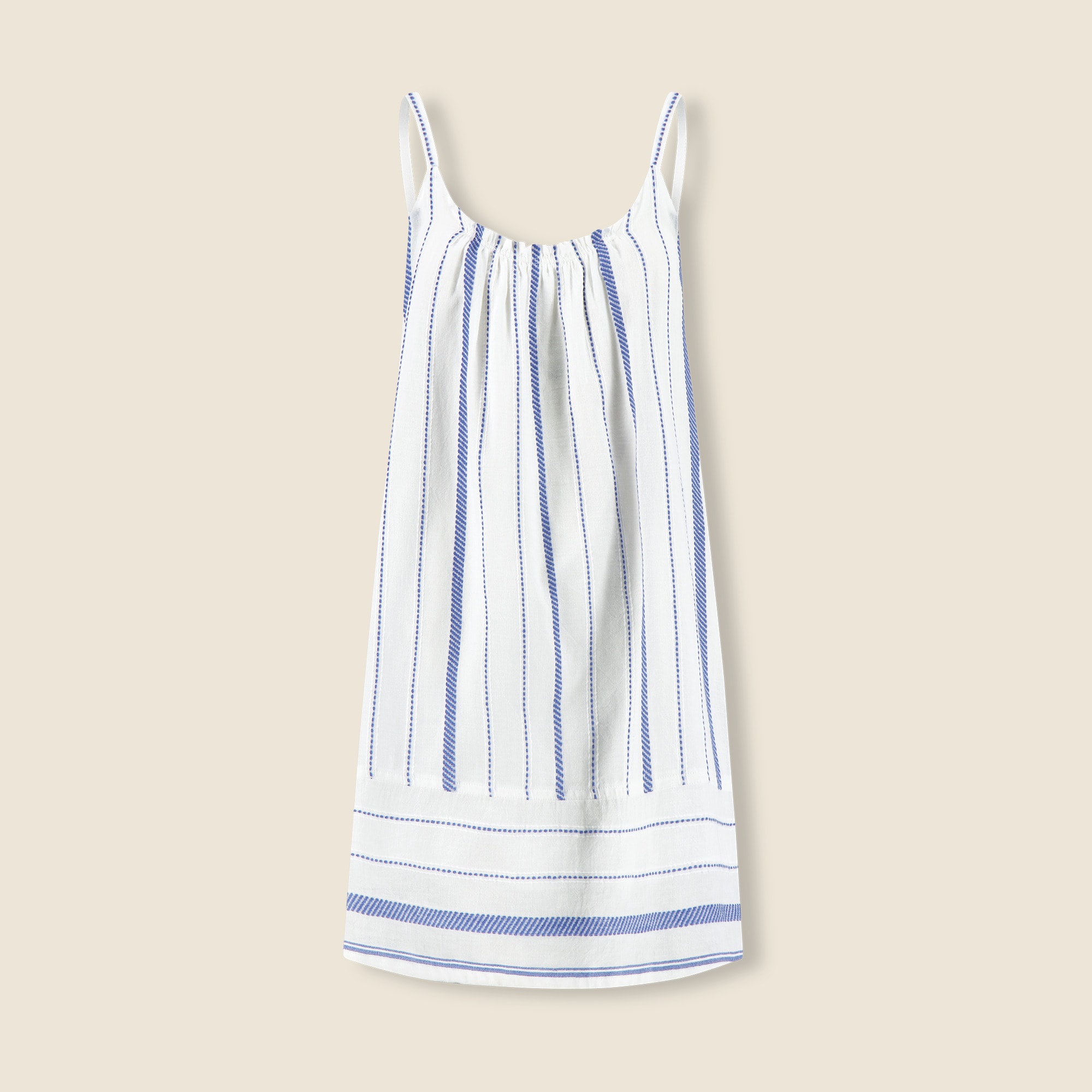 Supermodel and activist Liya Kebede started this handcrafted apparel and home collectionu0026mdash;named for the Ethiopian word meaning u0026quot;to bloom or flourishu0026quot;u0026mdash;and employs local African artisans to create its unique statement pieces. The Tiki Azure Collection features crisp fabric woven with diagonal dotted stripes in bright hue with a subtle textured weave, creating a clean and effortless look. This short dress boasts a ruched neckline, wide straps and a low scoopback. Ideal as a beach cover-up, the loose fit creates a relaxed silhouette. Handwoven in Ethiopia, this dress is made of a soft hand-spun cotton blend for a light and comfortable feel.