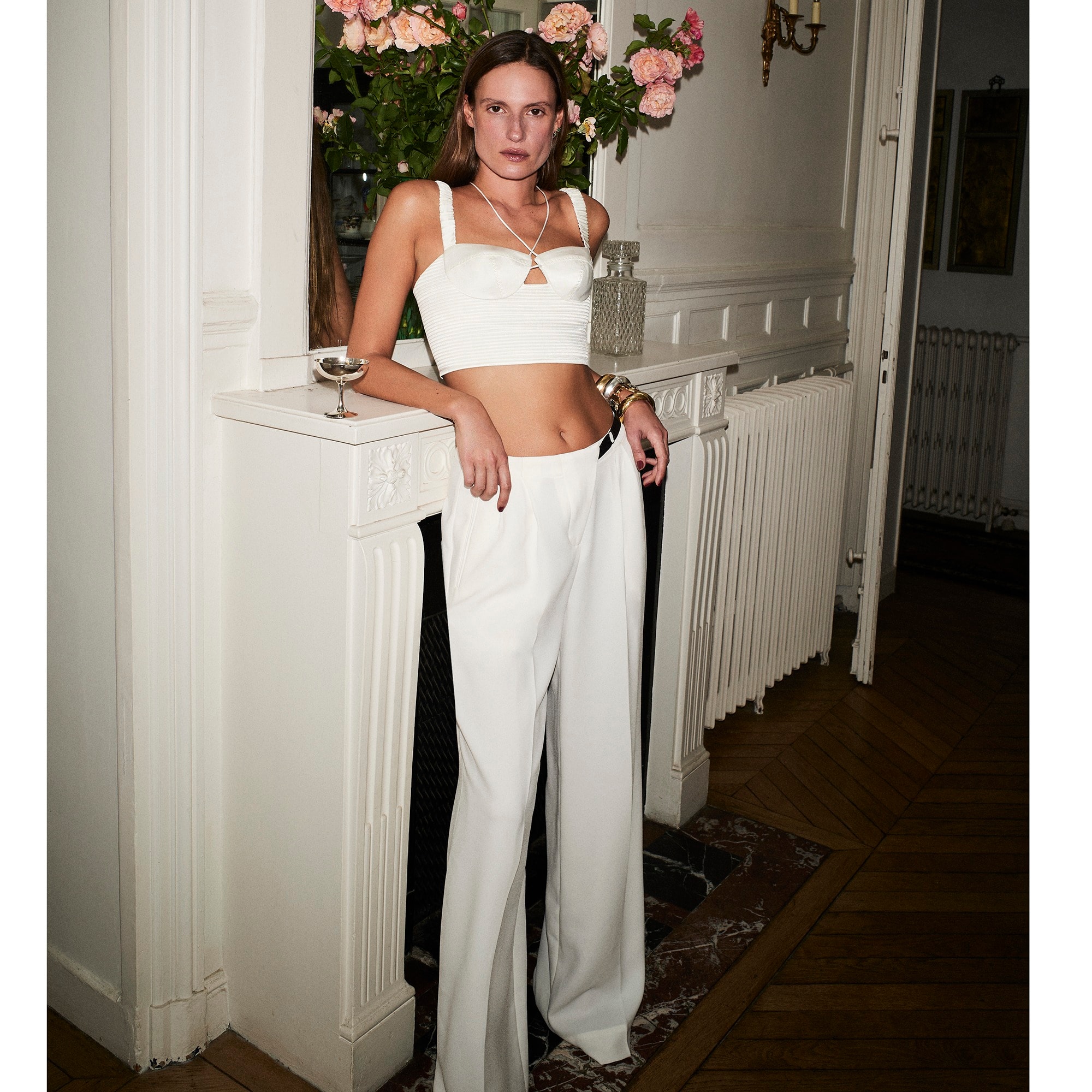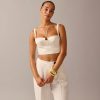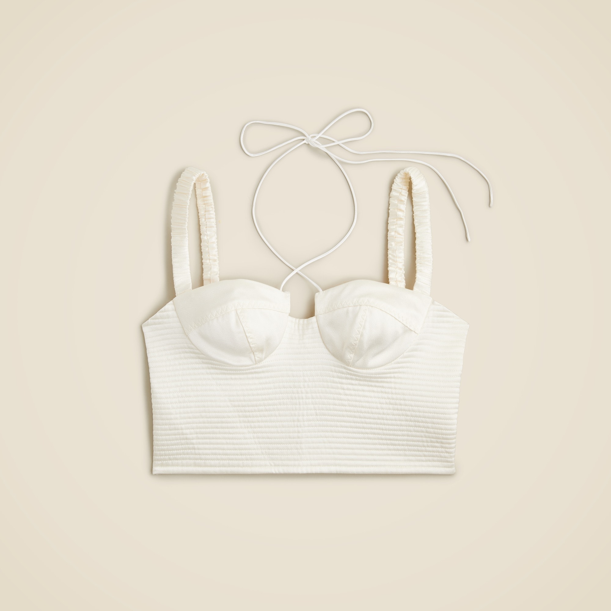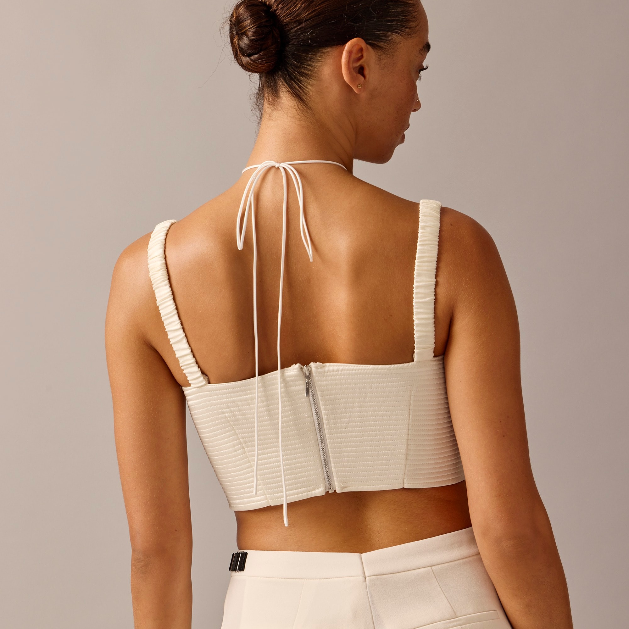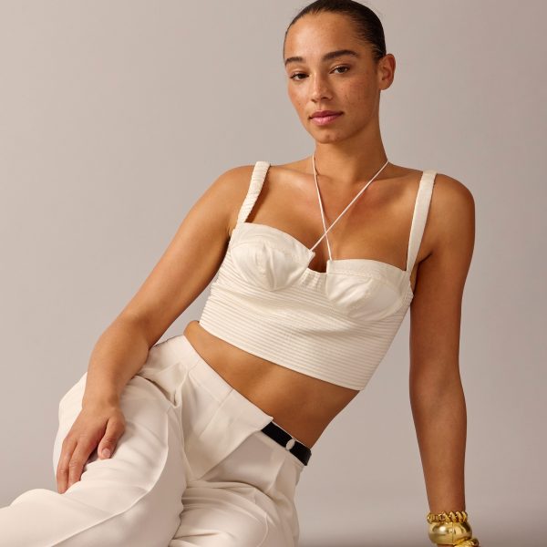 Introducing Anna October X J.Crew. We collaborated with the Ukrainian designer on an effortlessly sexy, party-ready capsule for the holiday season. This elevated cropped top has a bustier silhouette and gathered details along the straps and bodice. It also comes with two ties that can be worn crossed in the front, behind the neck or any other variety of ways.