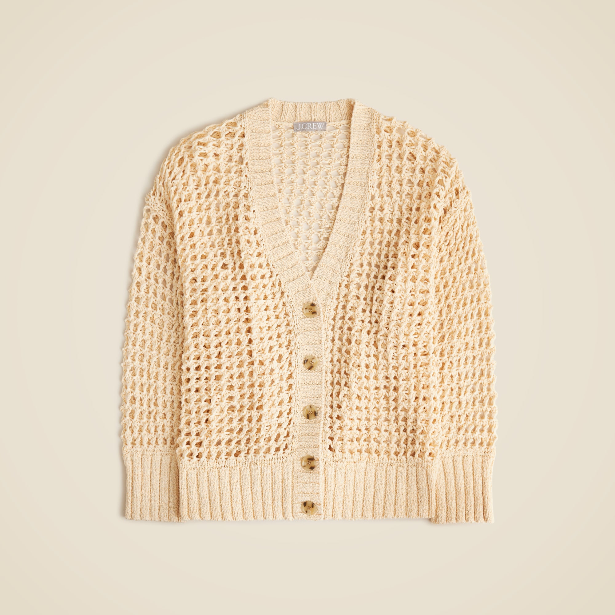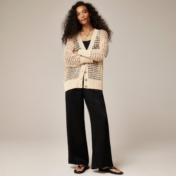 A net positive for your summer wardrobe. This oversized V-neck cardigan is knit in an airy, open stitch that nods to classic fisherman stylesu0026mdash;reinvented for warm-weather layering. With a relaxed fit, a button front and a longer length that hits below the hip, it’s the perfect piece to toss on over swimsuits, slip dresses or whatever you packed for the beach.
