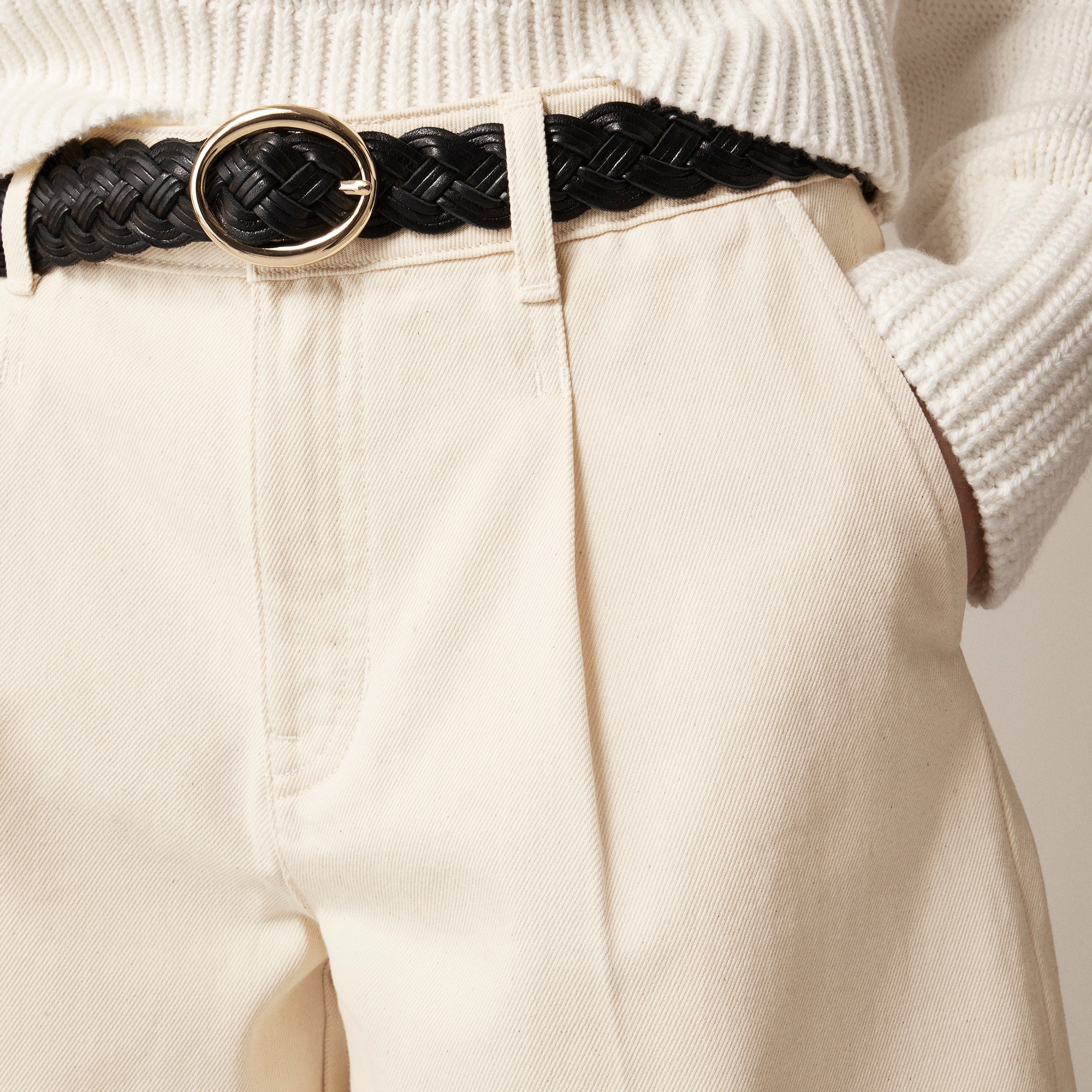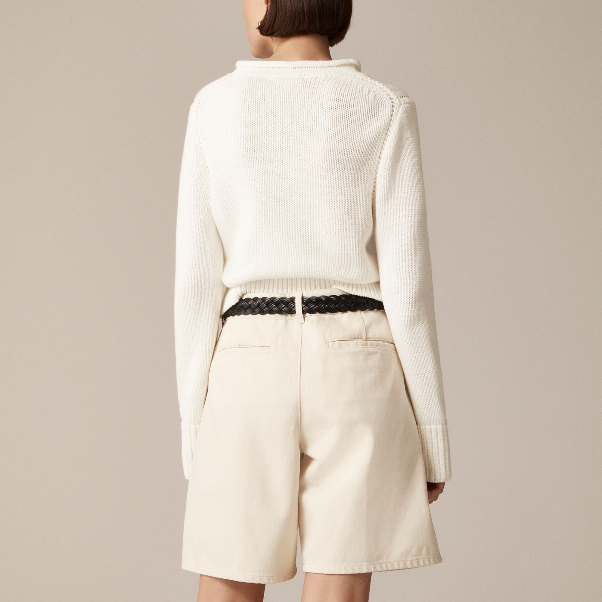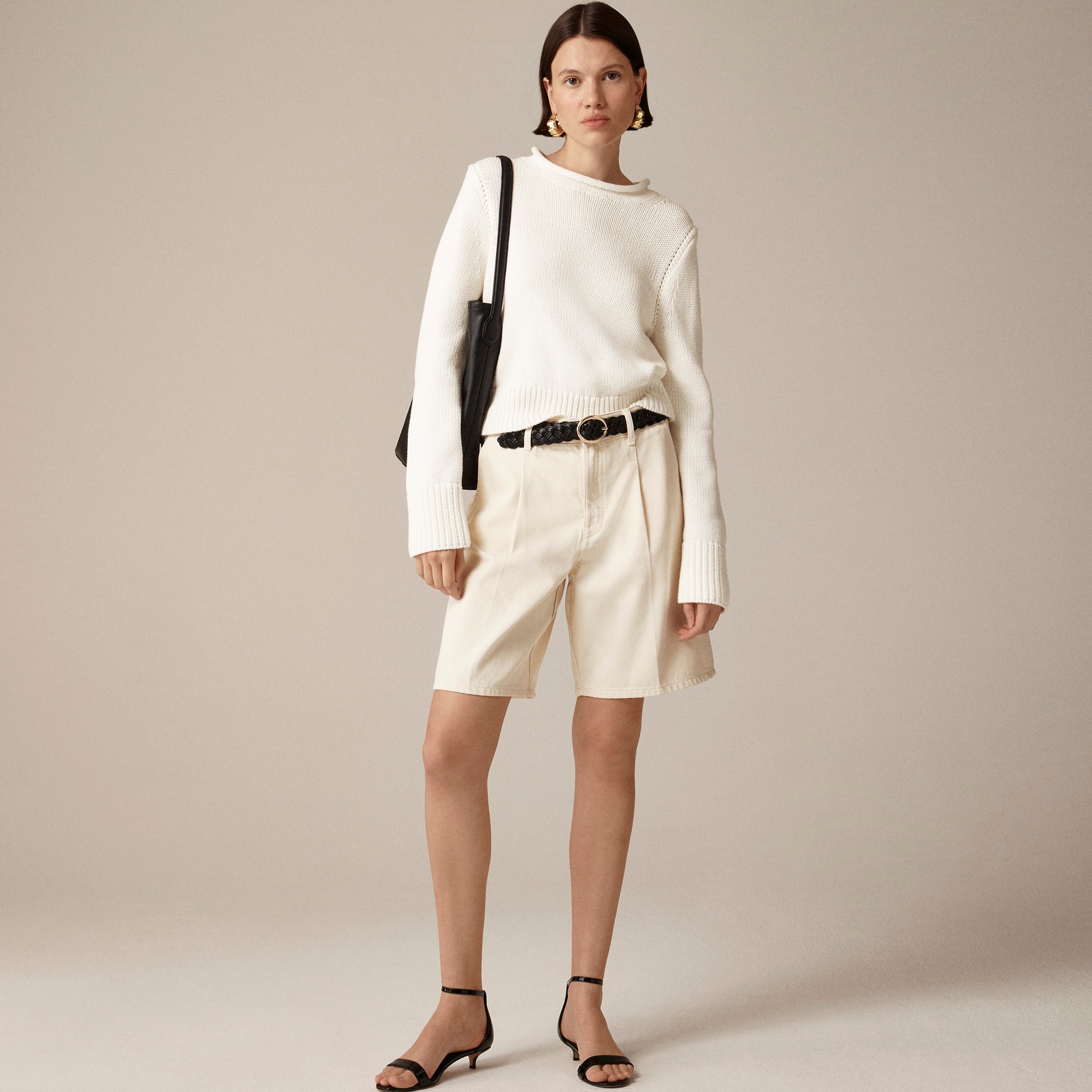 A modern take on the bermuda short. This style pairs classic denim texture with a tailored silhouette. It comes with polished front pleats, a longer length that hits at the knee and trouser-style pockets. All the cotton we use for this short is fully traceable to farms that are certified to the standards of regenagriu0026reg;, an agricultural program devoted to encouraging biodiversity, reducing greenhouse-gas emissions and securing the health of the land and the people who live and work there.