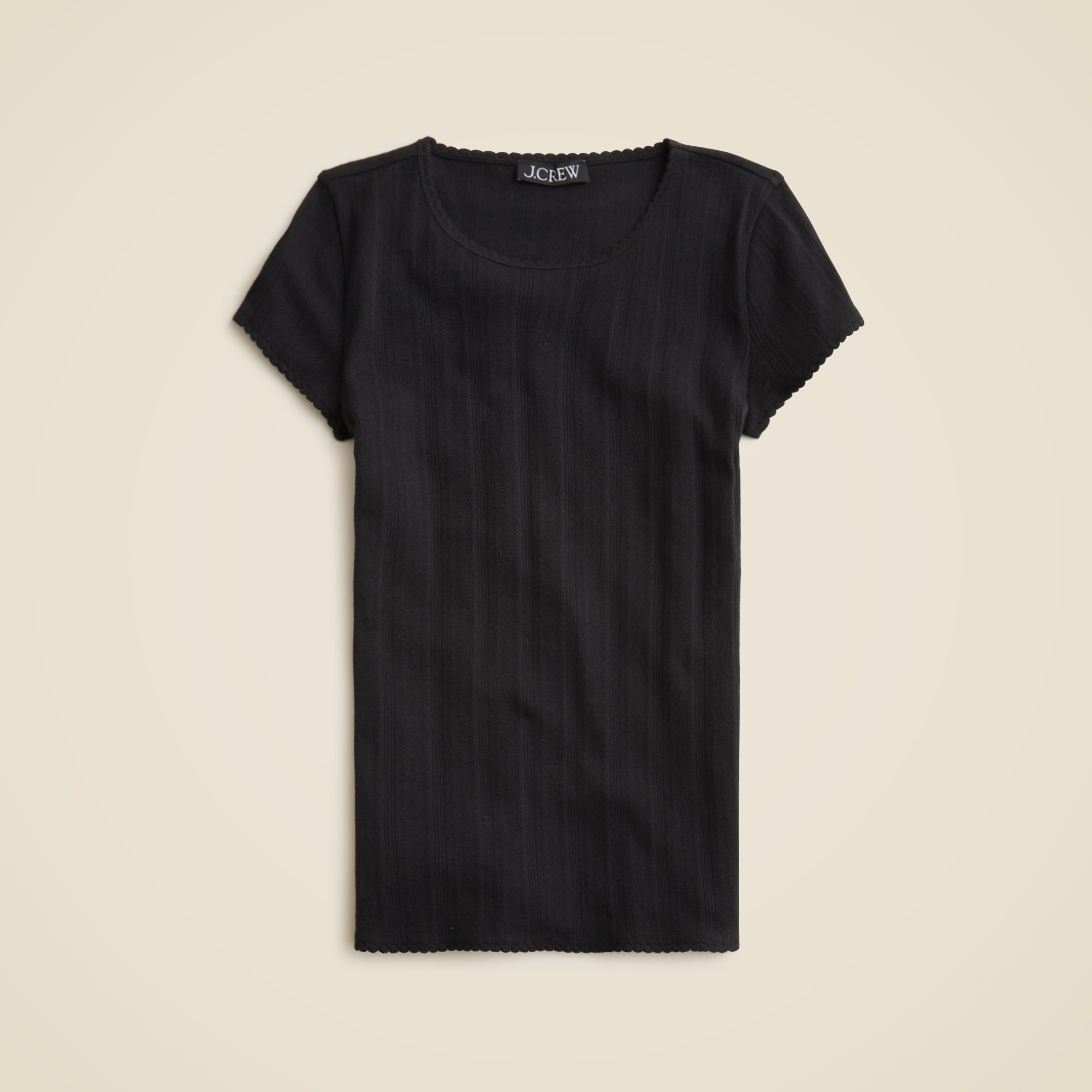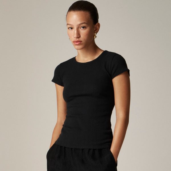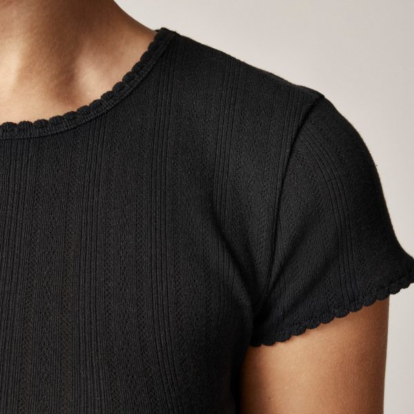 Subtly shrunken and intricately detailed, in 100 percent cotton. It comes with short sleeves, a classic length and a close fit all the way through, plus scalloped trim at the edges and dainty panels of pointelle stitching. Wear it on its own or under our pointelle cardigan for a matching moment.
