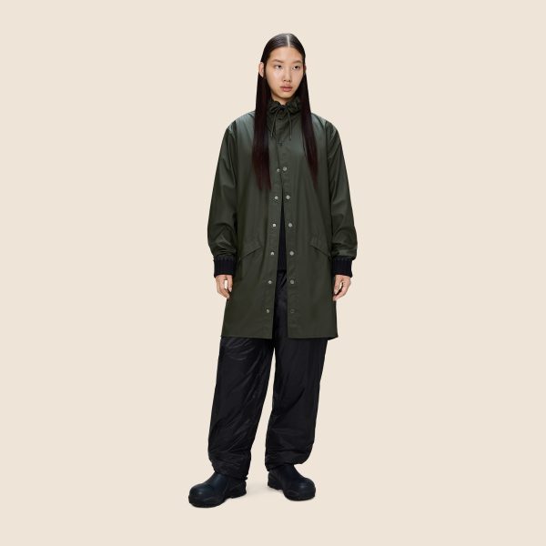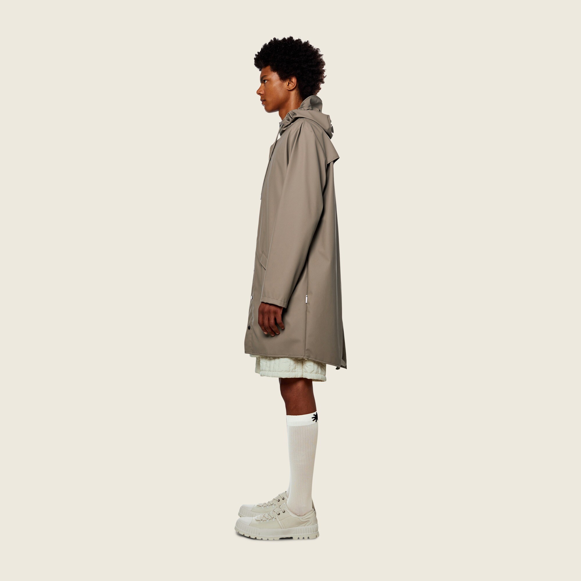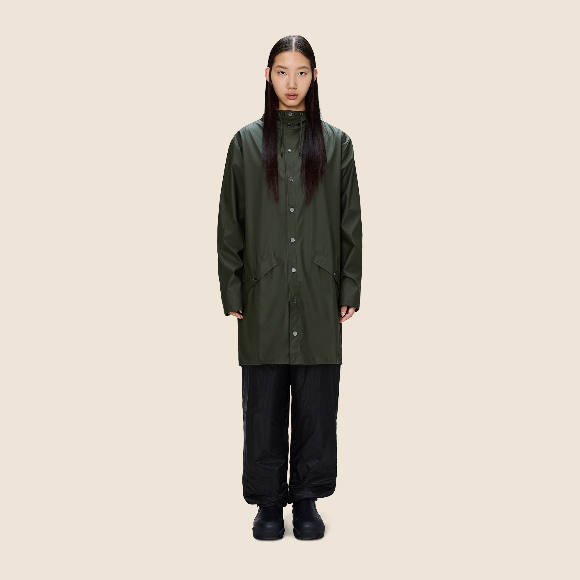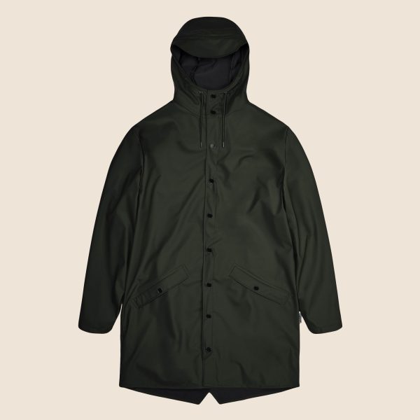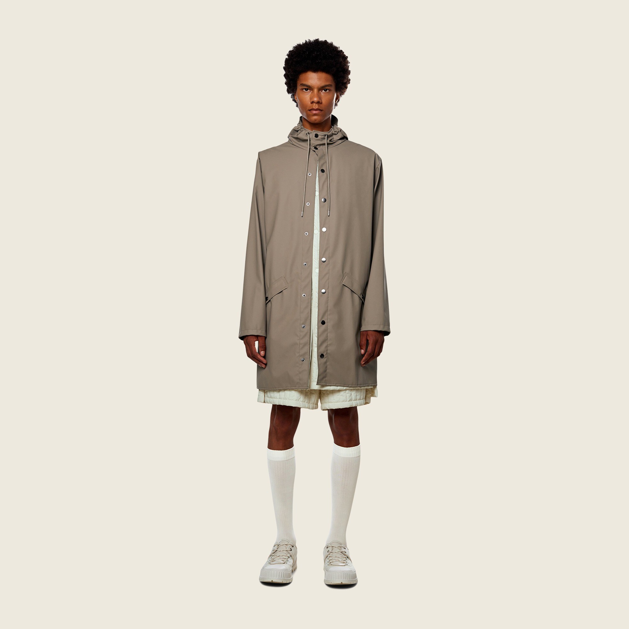 Long Jacket is a unisex rain jacket, characterized by a minimal silhouette in a long design. This rain jacket features a placket with snap fastenings for closure, a hood with a built-in cap and two side pockets with snaps. Sleeves are finished with snaps, making them adjustable for a loose or tight fit. The unisex rain jacket is complete with underarm eyelets and a back yoke with concealed vents for breathable comfort. Long Jacket is cut from Rains’s signature polyurethane fabric and features welded seams. Inspired by both Scandinavian weather patterns and clean Danish design, this innovative, Copenhagen-based brand is known for putting a fresh, modern spin on classic rubber outerwear and weatherproof accessories.