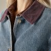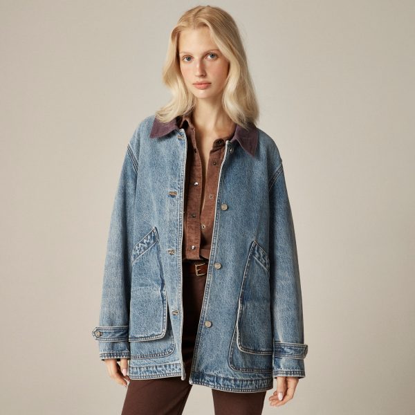 A J.Crew icon since 1983. . .Always evolving, this is the latest take on our signature Barn Jacket, a style that looks sleek and polished no matter what you’re wearing underneath. A couple of can’t-miss details: the relaxed fit, denim fabric, purple contrast corduroy collar and oversized patch pockets.