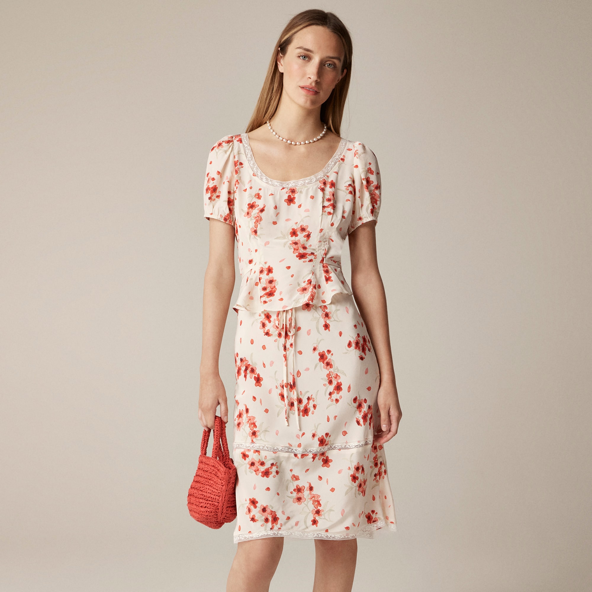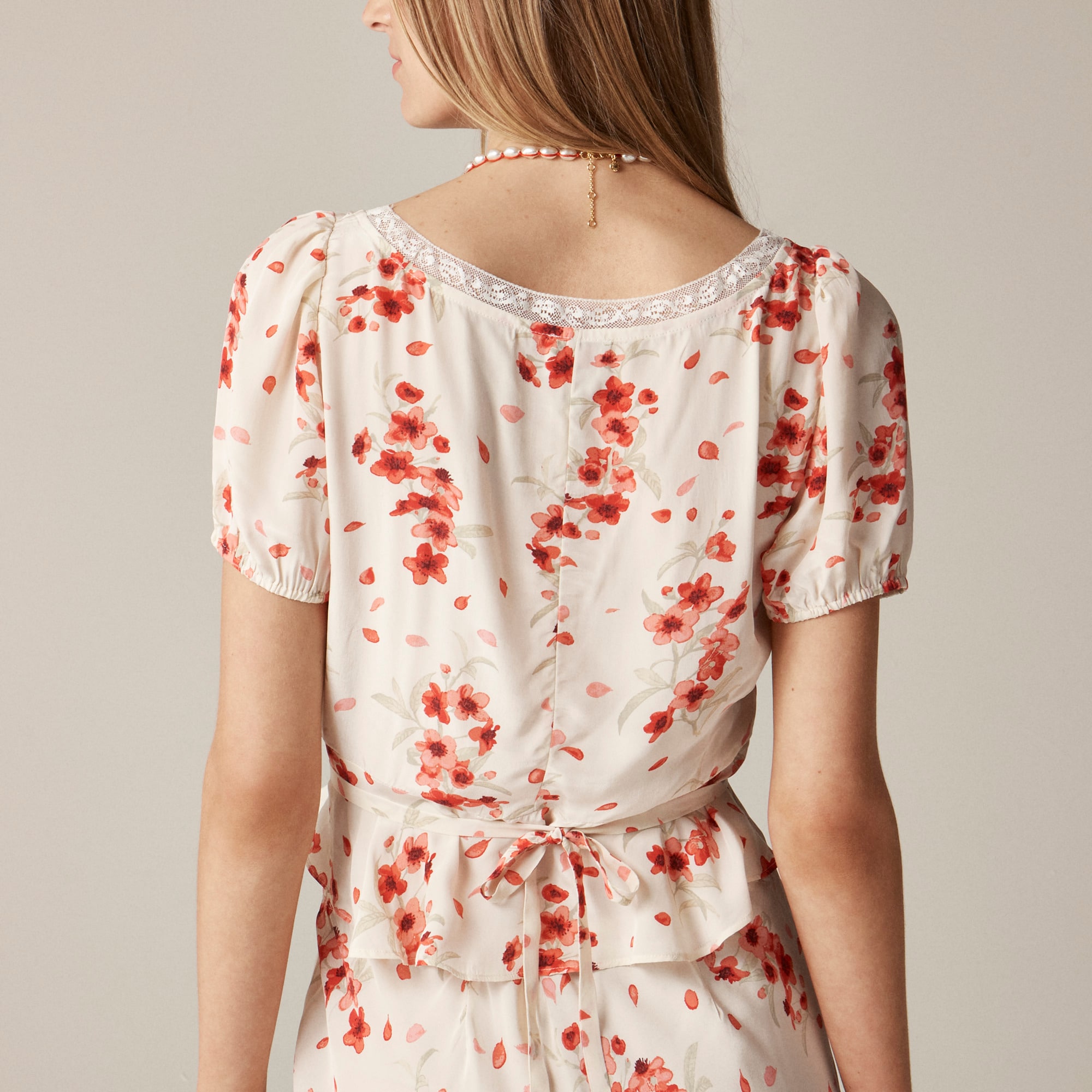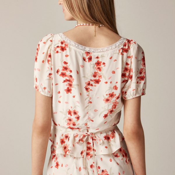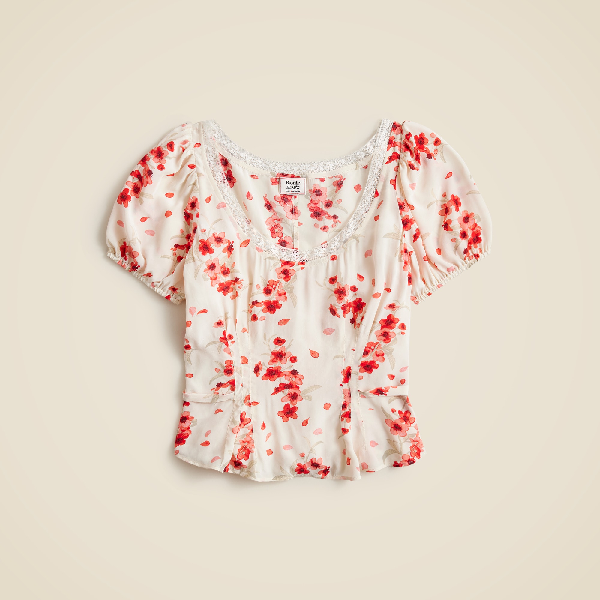 Paris meets New York. Rouje meets J.Crew. We collaborated with the Parisian brand on an exclusive capsule of romantic ’90s-inspired piecesu0026mdash;all with a certain u003ciu003eje ne sais quoiu003c/iu003e. This sweet top is all about the details like puff sleeves, a lace-trim neckline and a waist-cinching tie-back. Crafted from drapey viscose twill in a vintage-inspired print, it’s made for flower markets and bike rides home. We love it even more paired with the matching skirt.