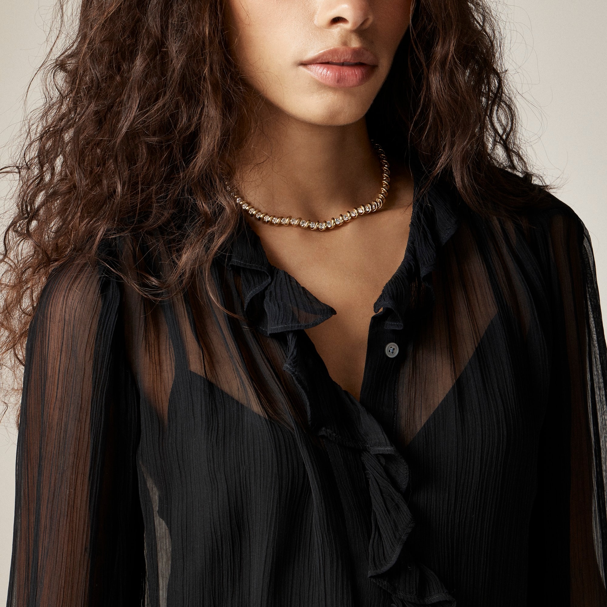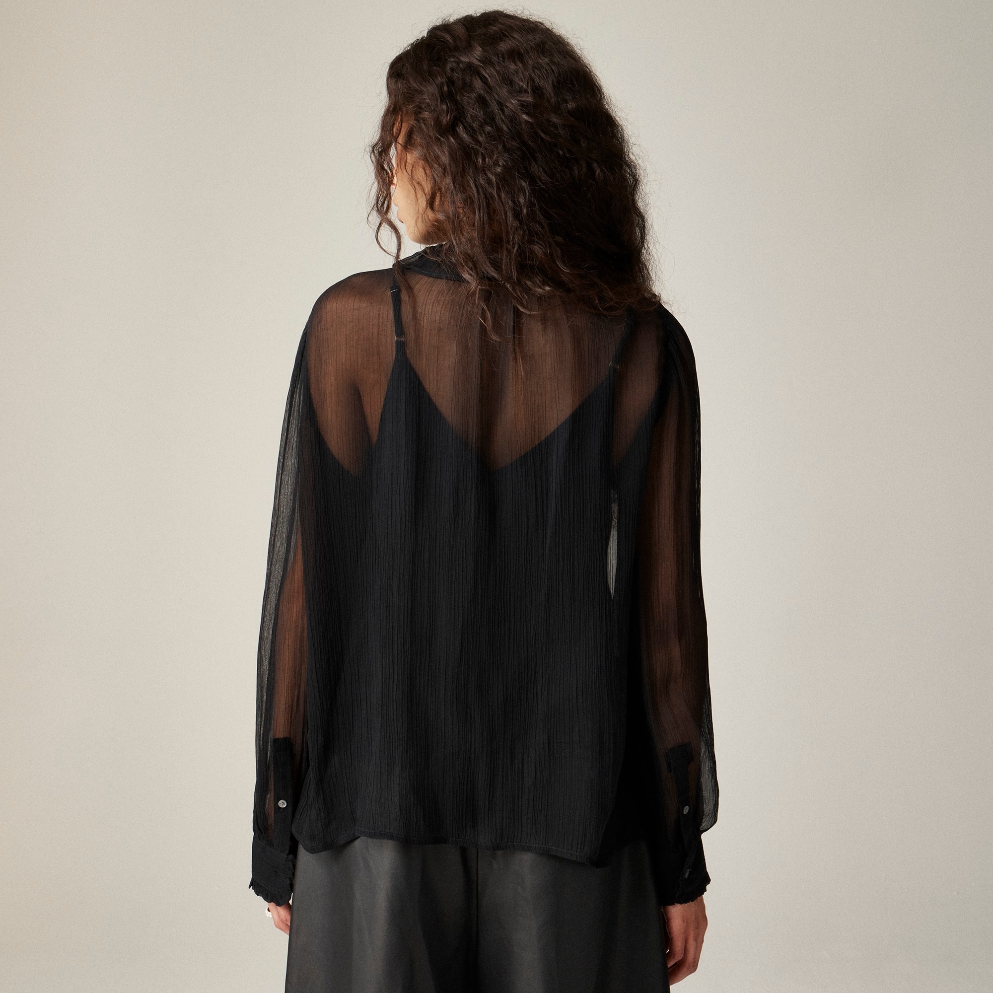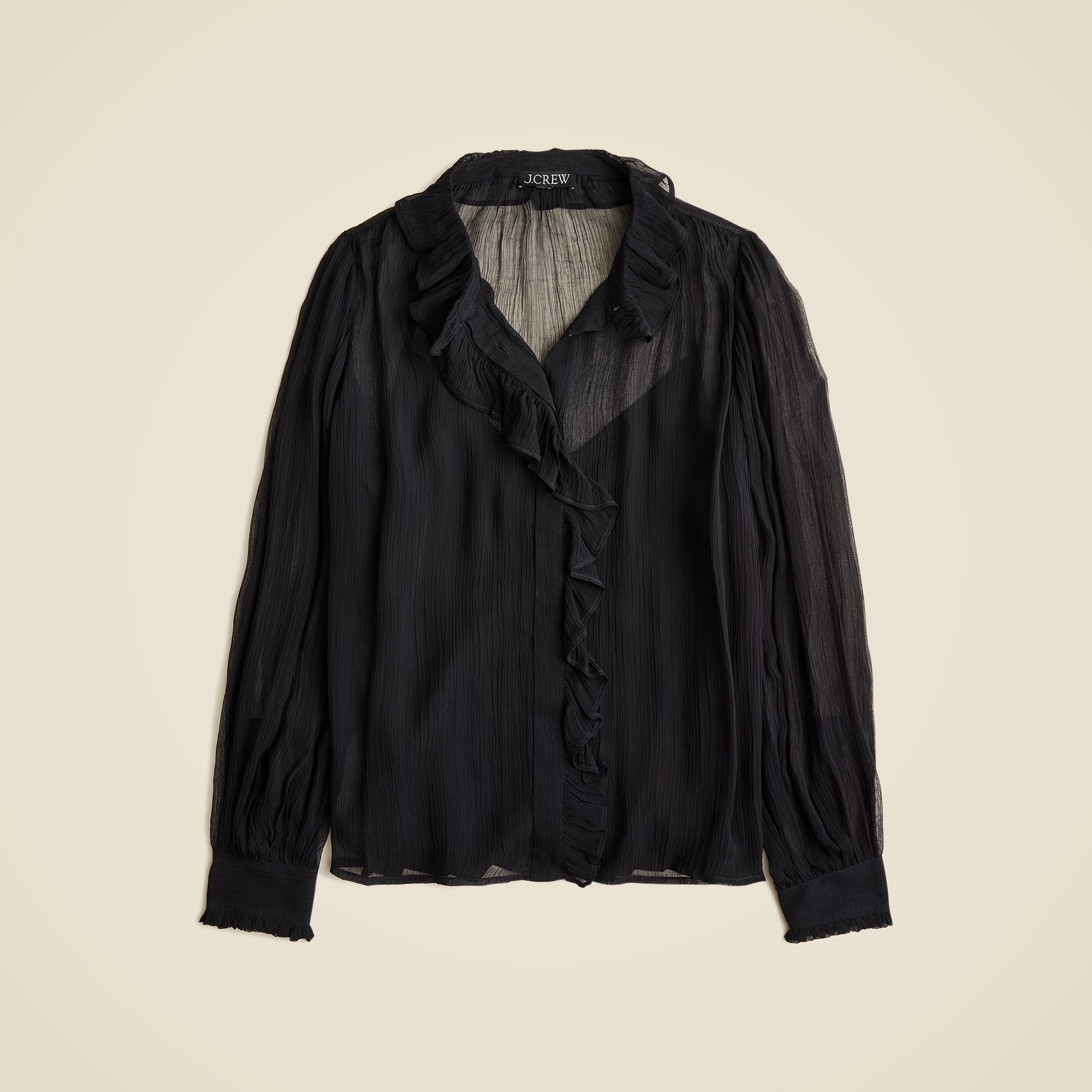 Your new day-to-night top. . .Crafted from subtly sheer crinkle chiffon (and lined with a camisole for coverage), this versatile, feminine style has ruffle details at the collar, cuffs and down the front. Wear it to work, on the weekend, wherever.