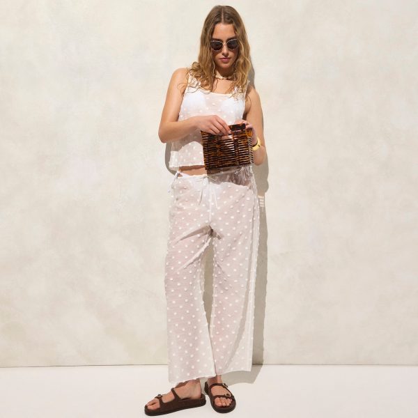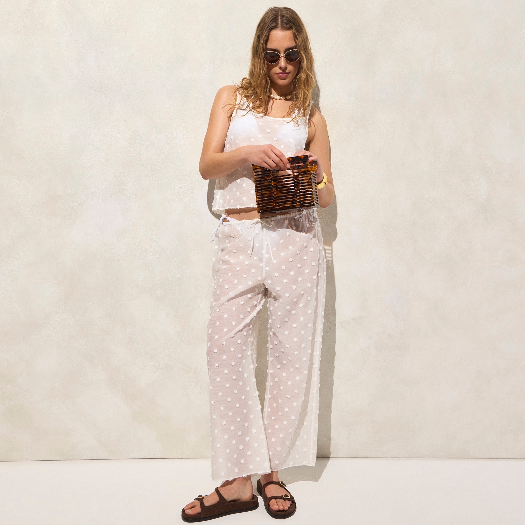 Playful details take this top to the next level. It comes with a classic scoopneck and fun pom-pom accents for a uniquely textured finish. Plus, it’s made with a subtly sheer cotton blend that’s lightweight and easy on the body. Pro tip: Pair it with the matching beach pant.