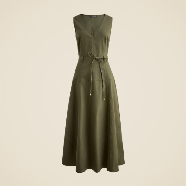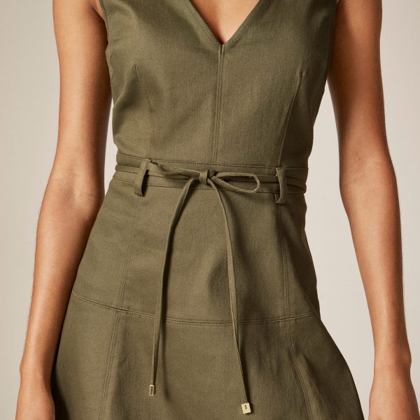 Clean lines meet everyday ease. This sleeveless silhouette melds structure and softness in all the right ways. It comes with a flattering V neckline, panel seaming and a gently flared skirt. Plus, the adjustable tie belt lets you cinch the waist just how you like, while the tailored twill fabric adds texture and shape.