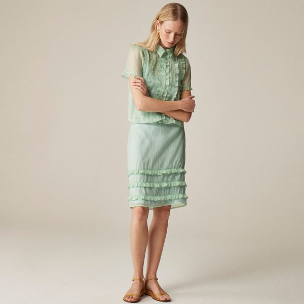 A playful mix of color and texture. This short-sleeve button-up comes with a sheer layer on top and a blue camisole lining underneath, plus lots of pretty ruffle detailing for all the visual interest. It’s crafted from a pre-crinkled fabric for a distinctive, dimensional look we love