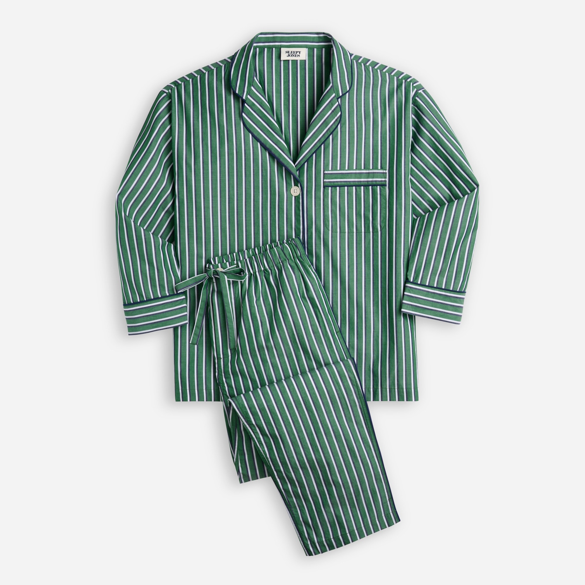 Sleepy Jones exists to help people rest and unplugu0026mdash;in order to reconnectu0026mdash;with ideas, creativity and with others. Our classic Marina pajama set is designed to be worn inside or outside of the bedroom. The top is comfortably oversized with a chest pocket and piping at the placket, cuffs and pocket. The pant has two side pockets, a button fly and an adjustable drawstring at the waist, plus slim piping along the outside seams. Made in a supersoft, fine cotton fabric.