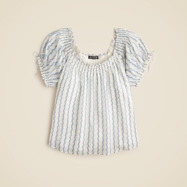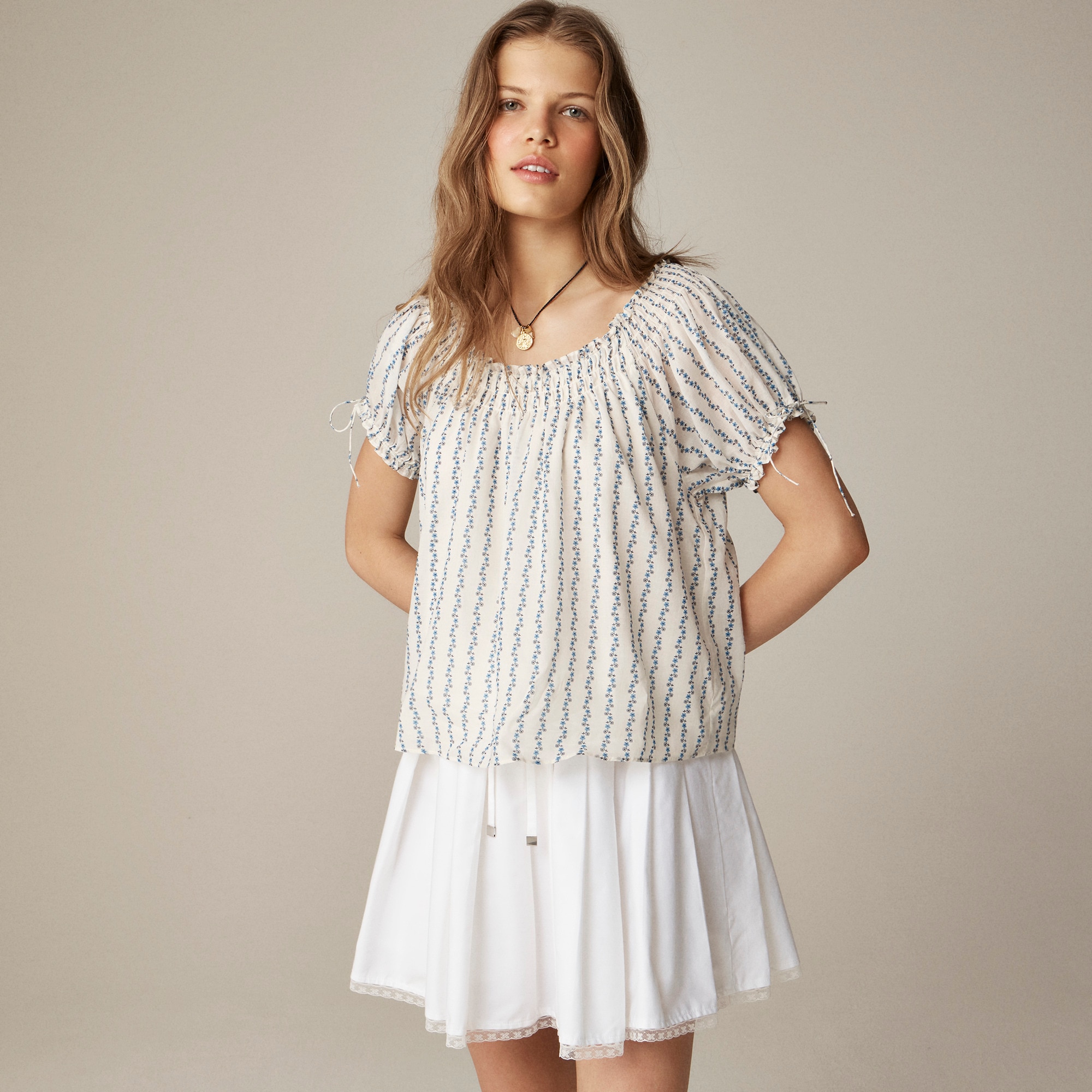 An everyday softie. Made from airy 100 percent cotton voile, this top features a smocked neckline, ties at the sleeves you can cinch to your liking and a floaty ruffle trim.