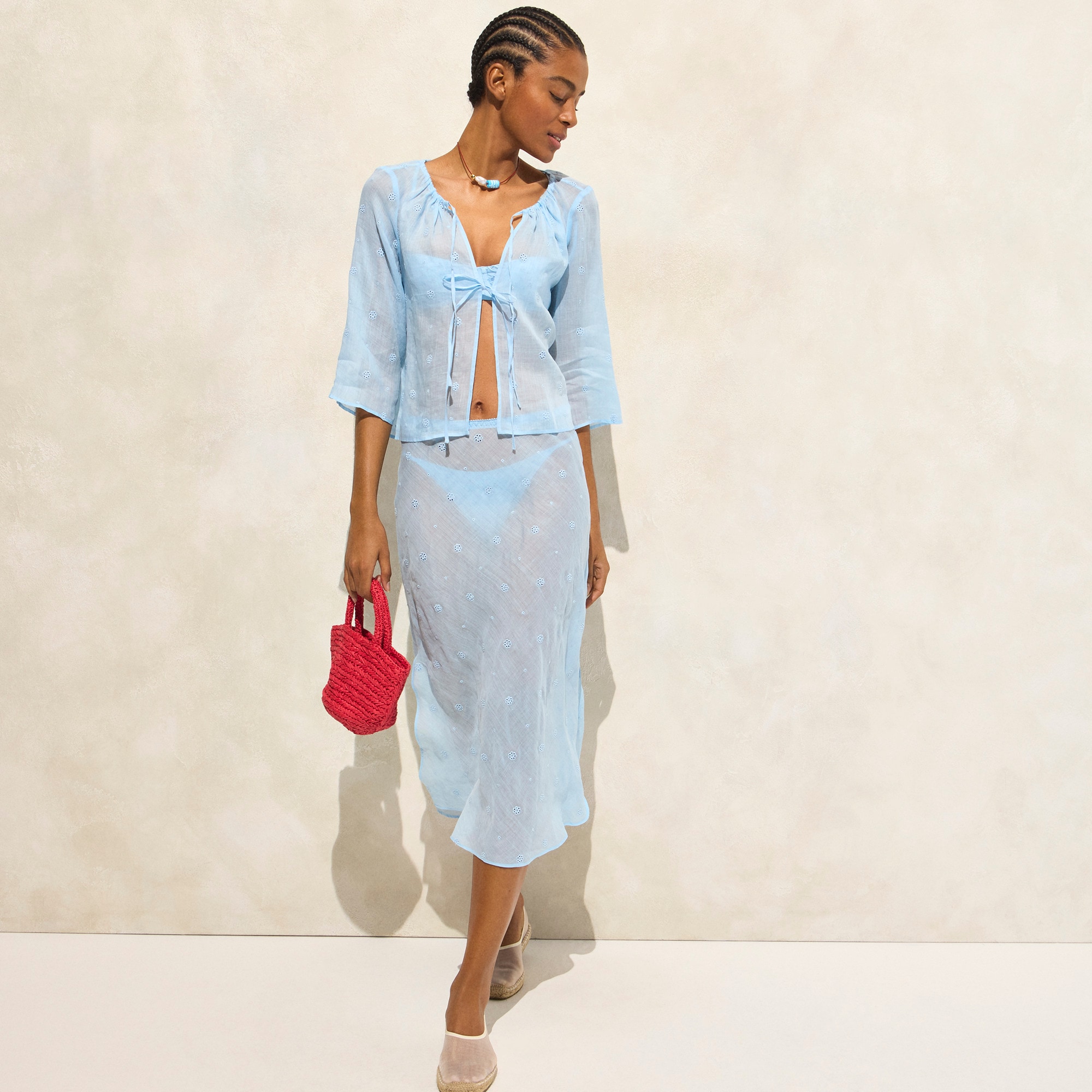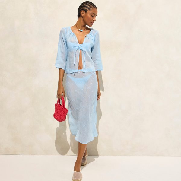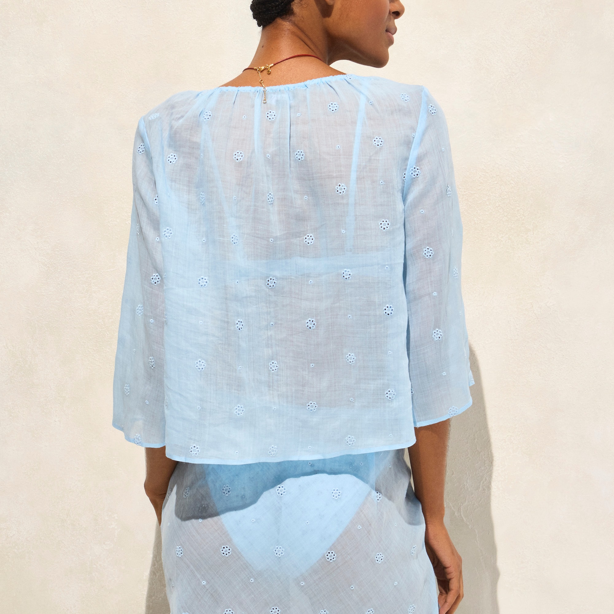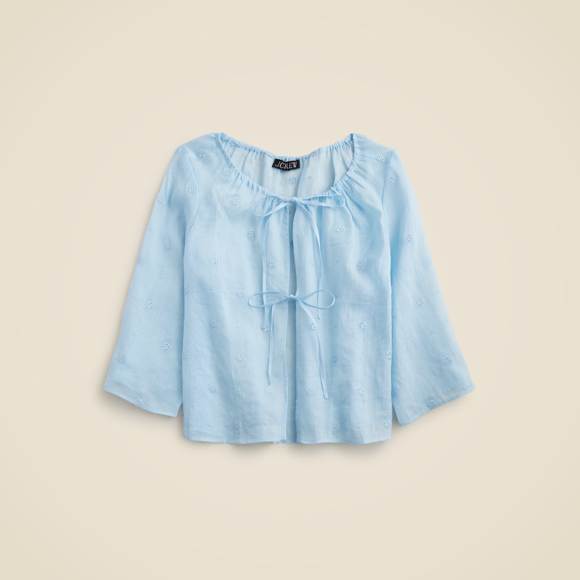 How to elevate your beach-day outfits. With this sheer, airy top, complete with two tie details down the front and intricate eyelet embroidery all over. Plus, it’s crafted from 100 percent ramie, a breathable, natural fabric that’s like an alternative to linen.