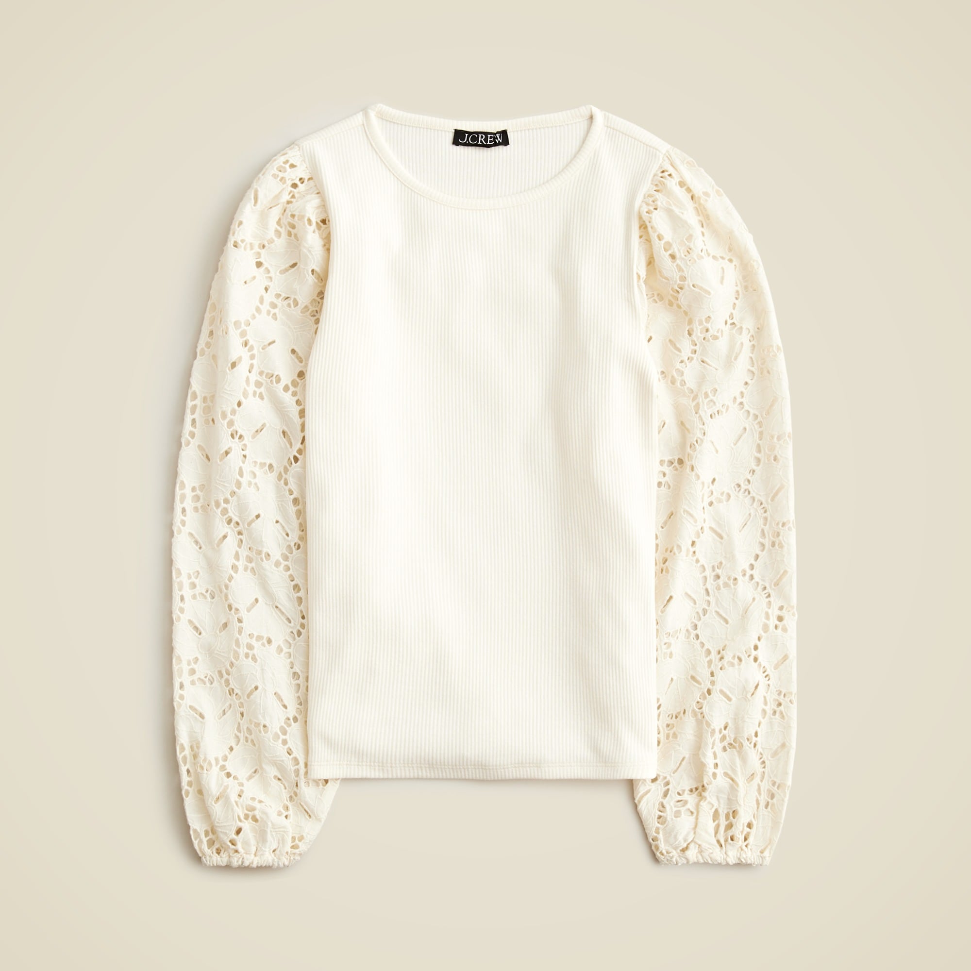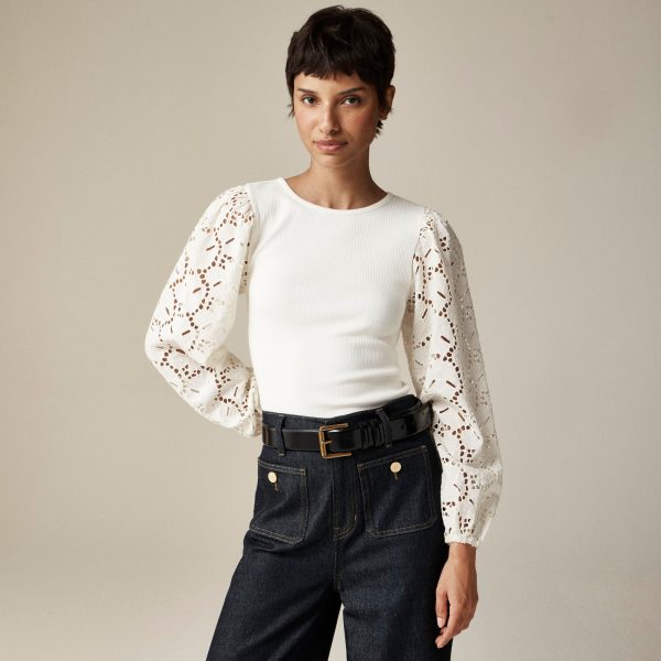 Effortlessly intricate and ultra-comfortable. Crafted from vintage rib, a lightweight cotton blend inspired by easy styles of the ’70s, with a very soft feel and just a hint of stretch and elevated with airy eyelet puff sleeves in our customer-favorite cotton poplin.