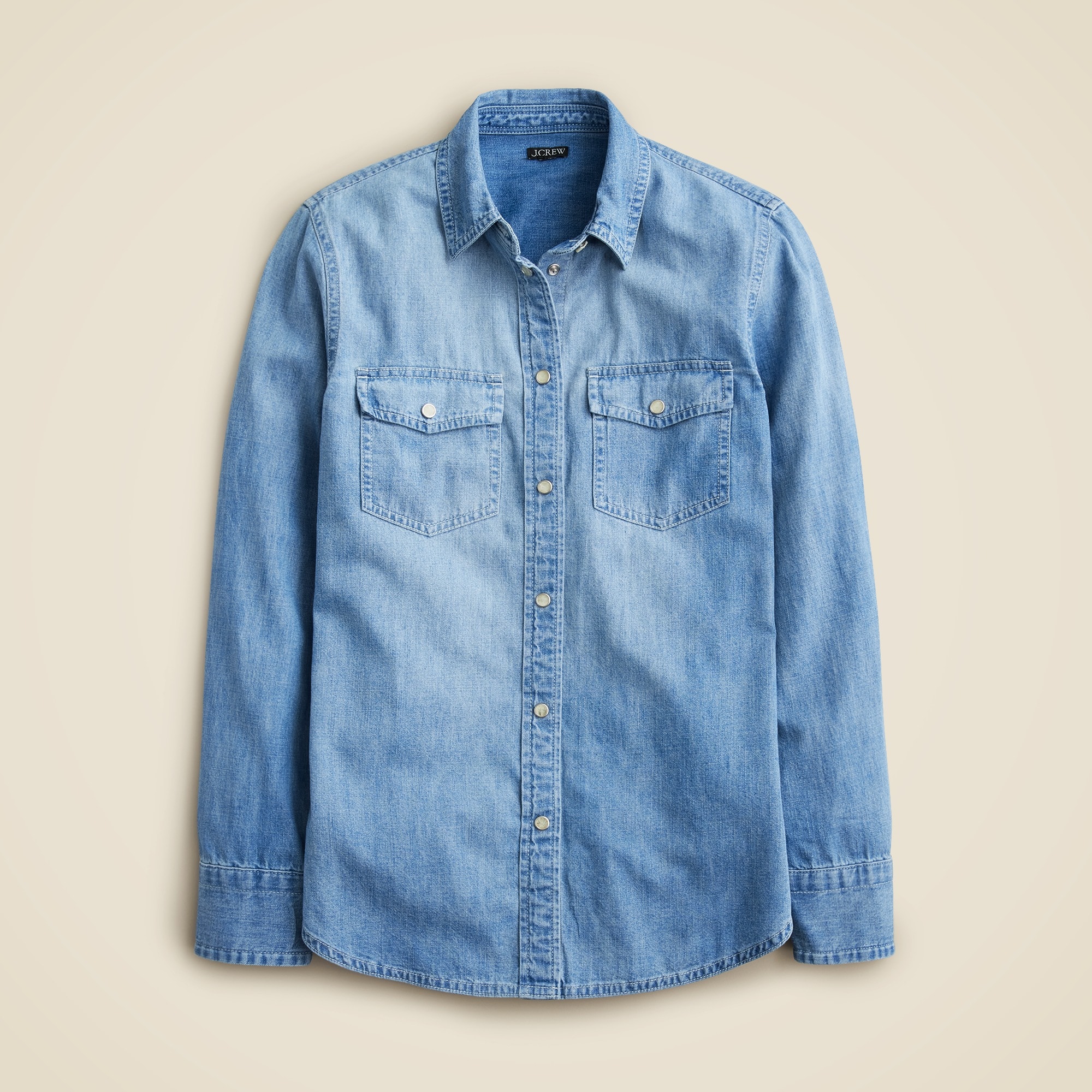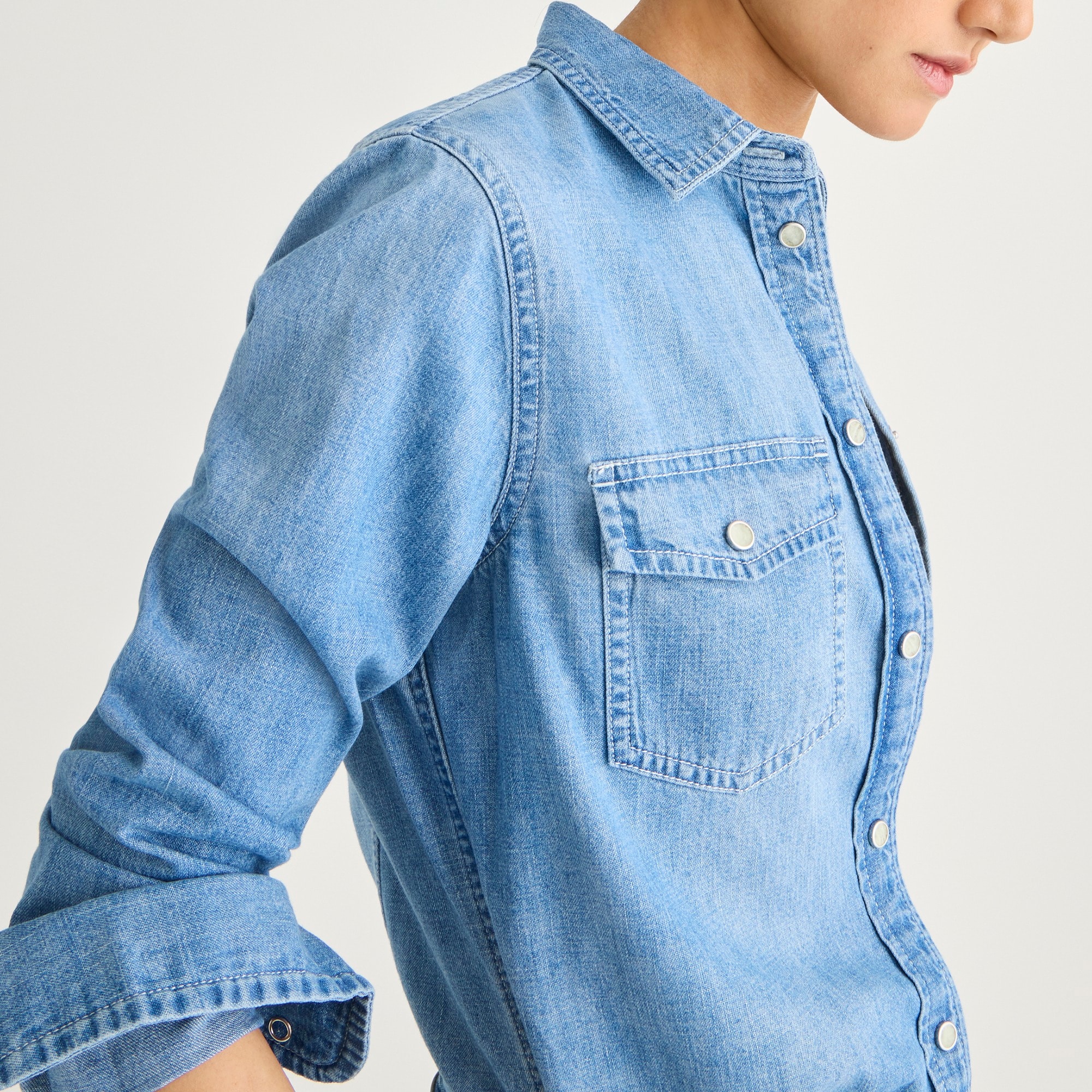 Our most fitted silhouette, now with western-inspired details. One of the latest additions to our shirt collection, this style is just the right length to tuck in without any bunching. This shirt also has pops of contrast stitching, two chest pockets and small snap buttons. Plus, it’s made with our durable and finely textured chambray fabric that goes with everything. By buying cotton products from J.Crew, you’re supporting our investment in Better Cotton’s mission to help cotton communities survive and thrive, while protecting and restoring the environment. This product is sourced via a system of mass balance and therefore may not contain Better Cotton.